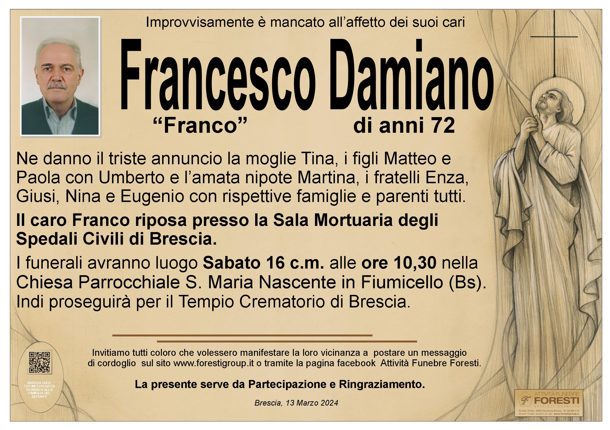 Damiano Giusy, Enza e nina sorelle amatissime si stringono in un forte abbraccio, piangono la perdita improvvisa del loro fratello. Iervolino Claudio e figli Letizia, Roberto e Fabio. Era un uomo eretto e amatissimo dalla famiglia ci stringiamo al vostro dolore, sentite condoglianze. Iervolino Leopoldo e figli Alessandro, Gabriella e Anna nostre sentite condoglianze alla famiglia. Letizia e Simona il secondo angelo è andato in cielo,lo ricorderemo per sempre. ti vogliamo bene Zio Franco