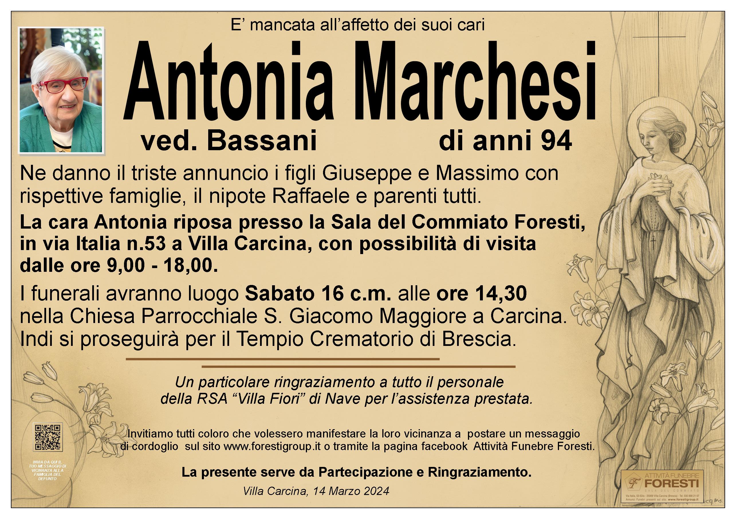 La cara Antonia riposa presso la Sala del Commiato Foresti, in via Italia n.53 a Villa Carcina, con possibilità di visita dalle ore 9,00 - 18,00.