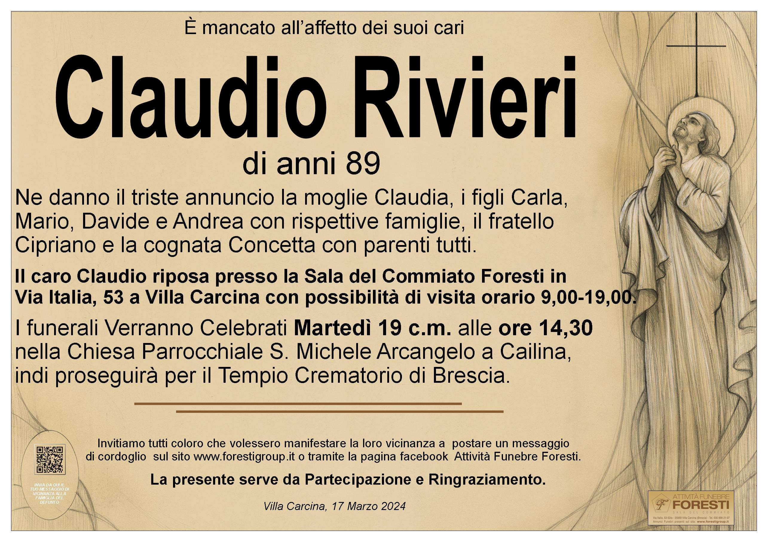 Sentite condoglianza a Claudia, Carla, Mario, Davide, Andrea e familiari tutti per la perdita del caro Claudio. Vi siamo vicini nella preghiera. Davide Pedrini, Roberto, Michela e famiglie.