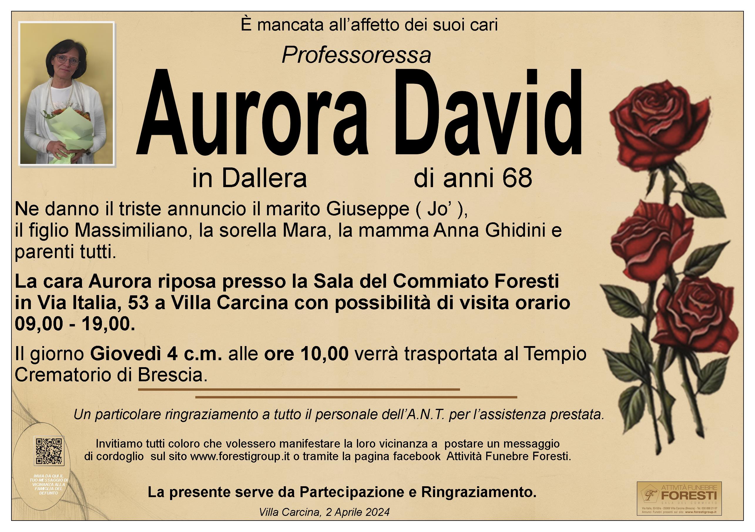 Cara Aurora, di te ho conservato il ricordo dei tempi di scuola, della tua presenza discreta, della tua attitudine allo studio, del tuo sorriso dolce. Buon viaggio, dovunque tu sia diretta. Condoglianze alla sorella Mara e a tutta la famiglia.