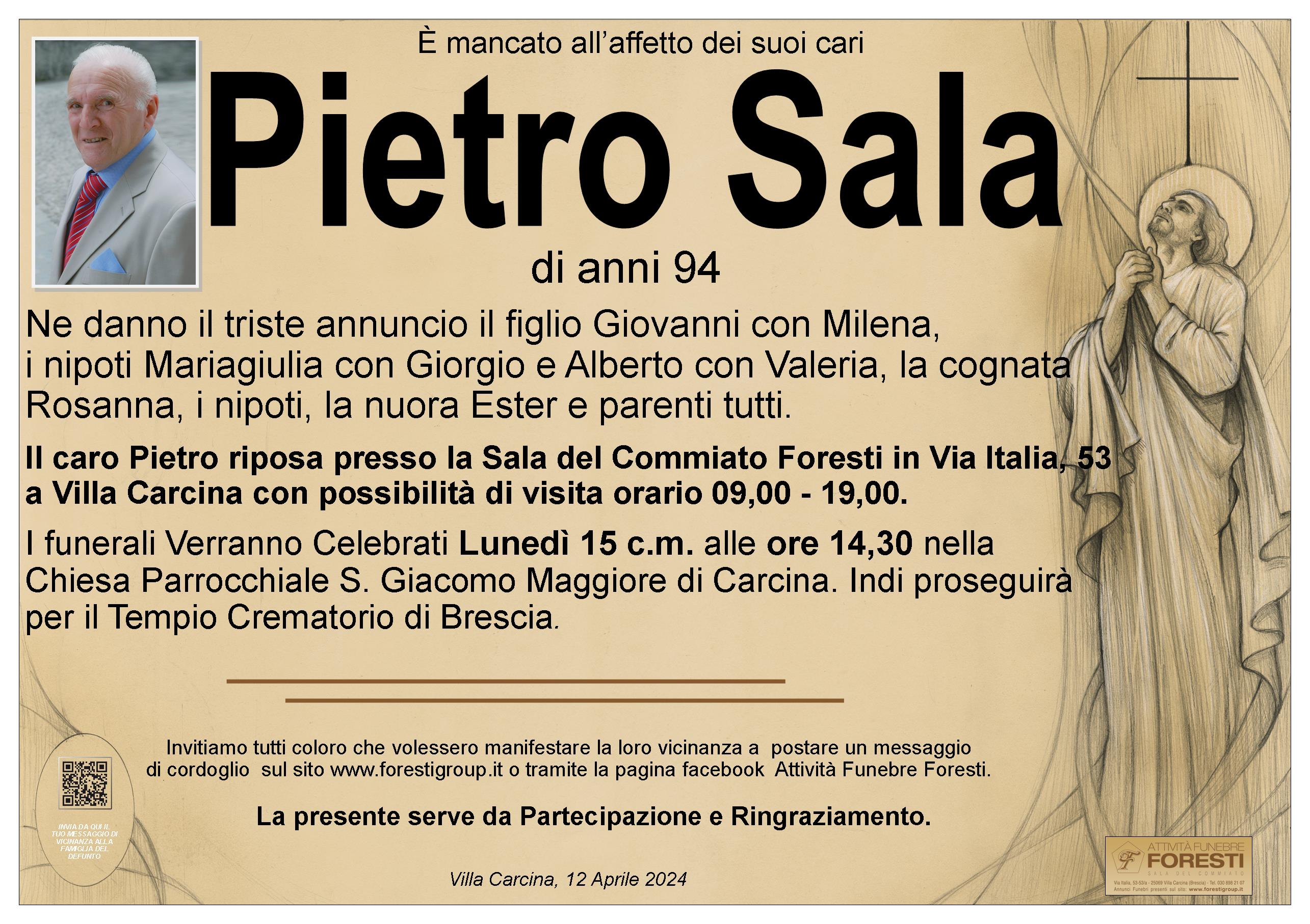 Il caro Pietro riposa presso la Sala del Commiato Foresti in Via Italia, 53 a Villa Carcina con possibilità di visita orario 09,00 - 19,00.