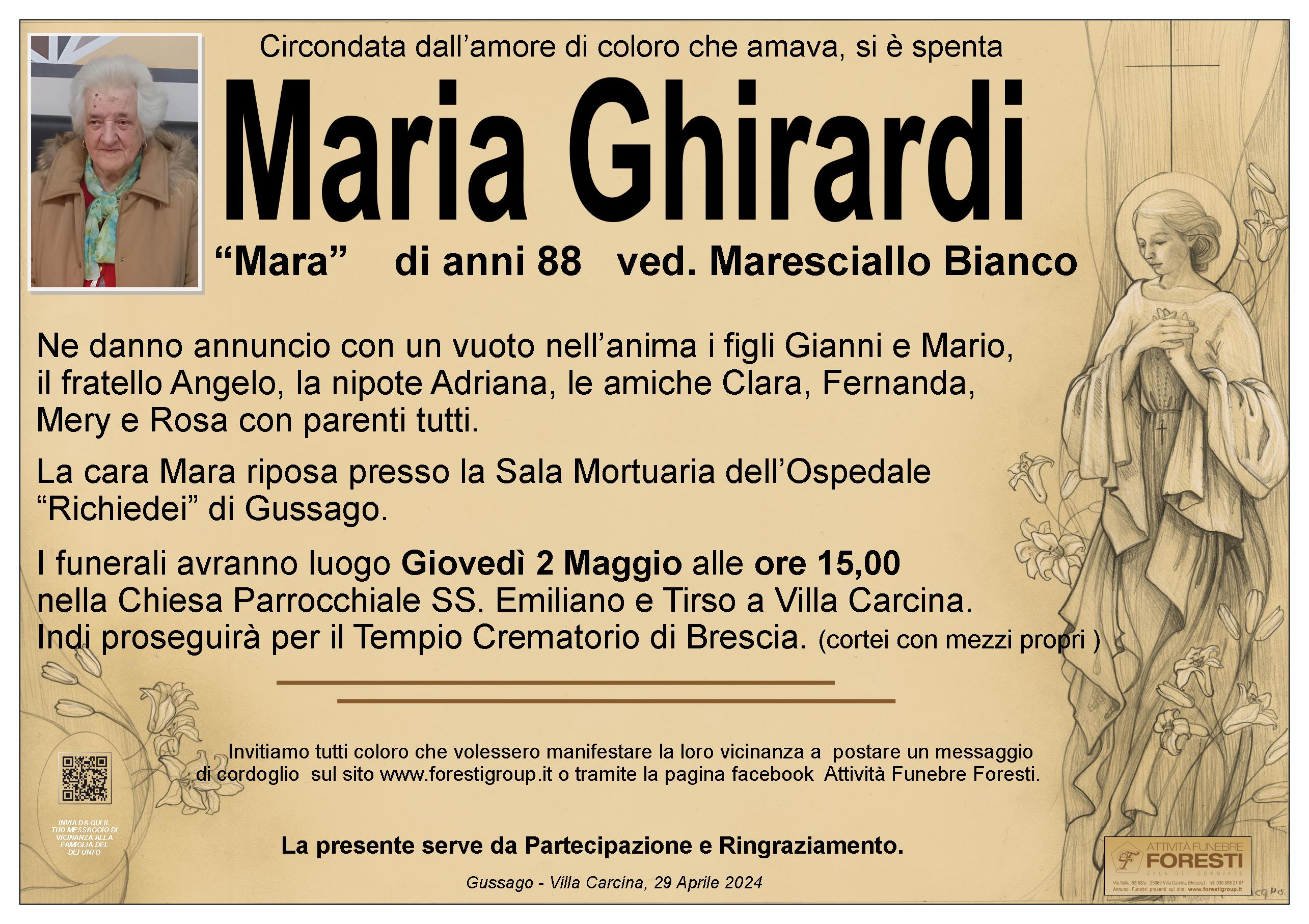 I funerali avranno luogo Giovedì 2 Maggio alle ore 15,00 nella Chiesa Parrocchiale SS. Emiliano e Tirso a Villa Carcina. Indi proseguirà per il Tempio Crematorio di Brescia.