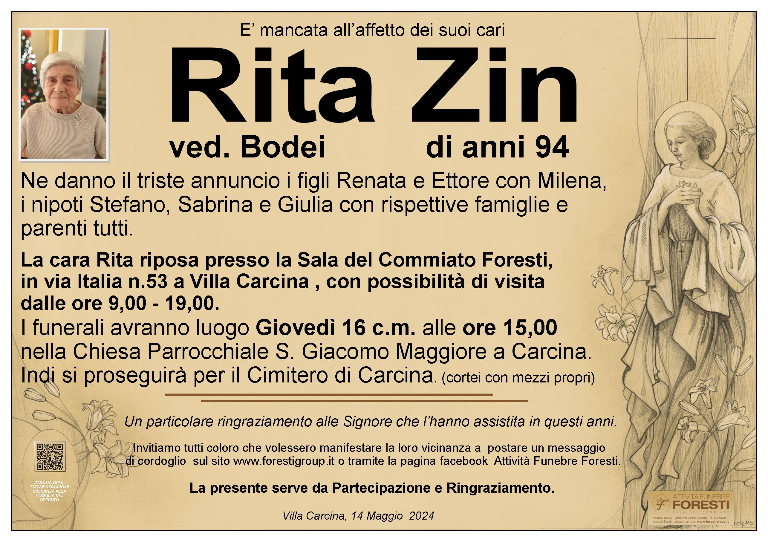 La cara Rita riposa presso la Sala del Commiato Foresti, in via Italia n.53 a Villa Carcina , con possibilità di visita dalle ore 9,00 - 19,00.