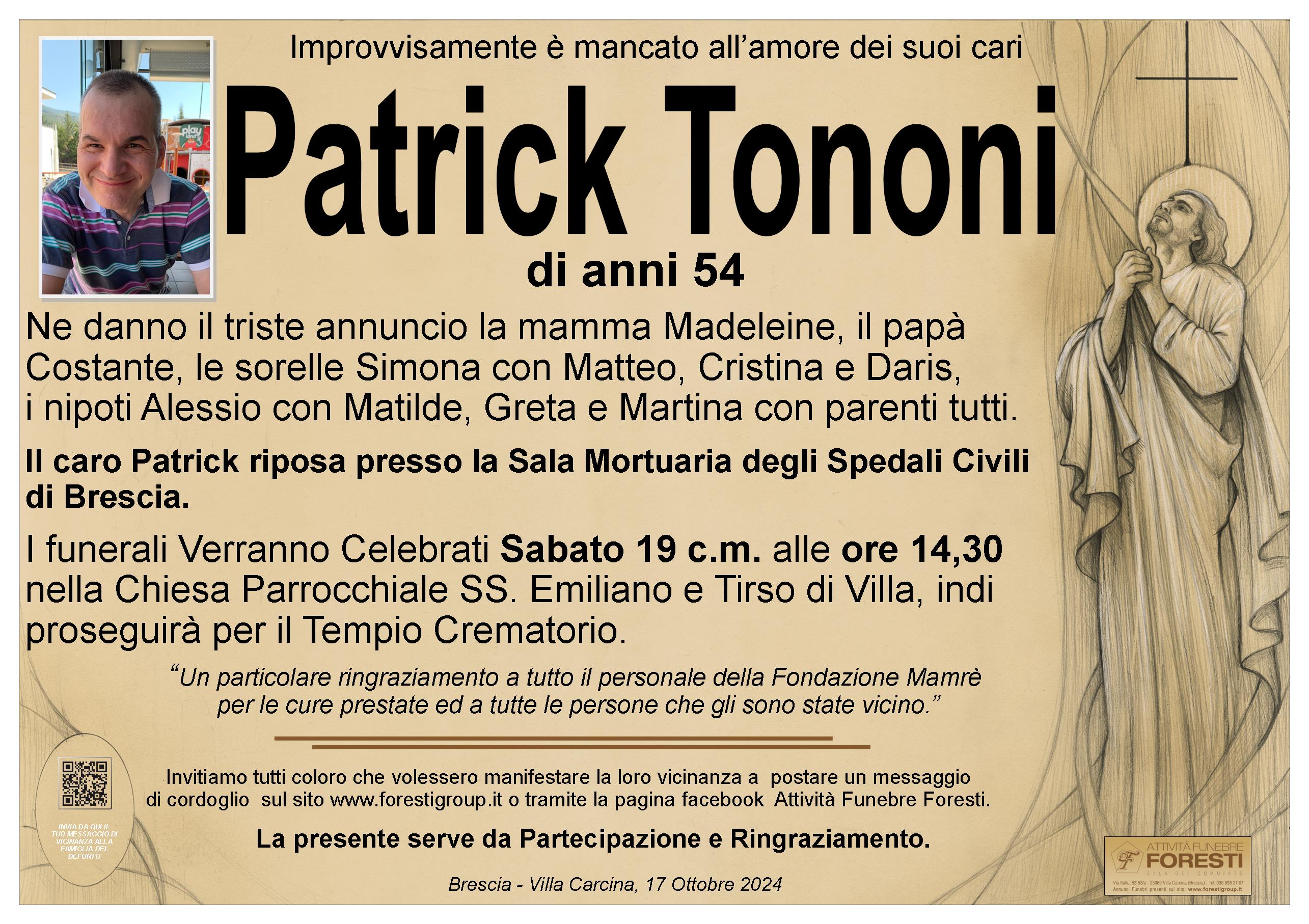 Il caro Patrick riposa presso la Sala Mortuaria degli Spedali Civili di Brescia.