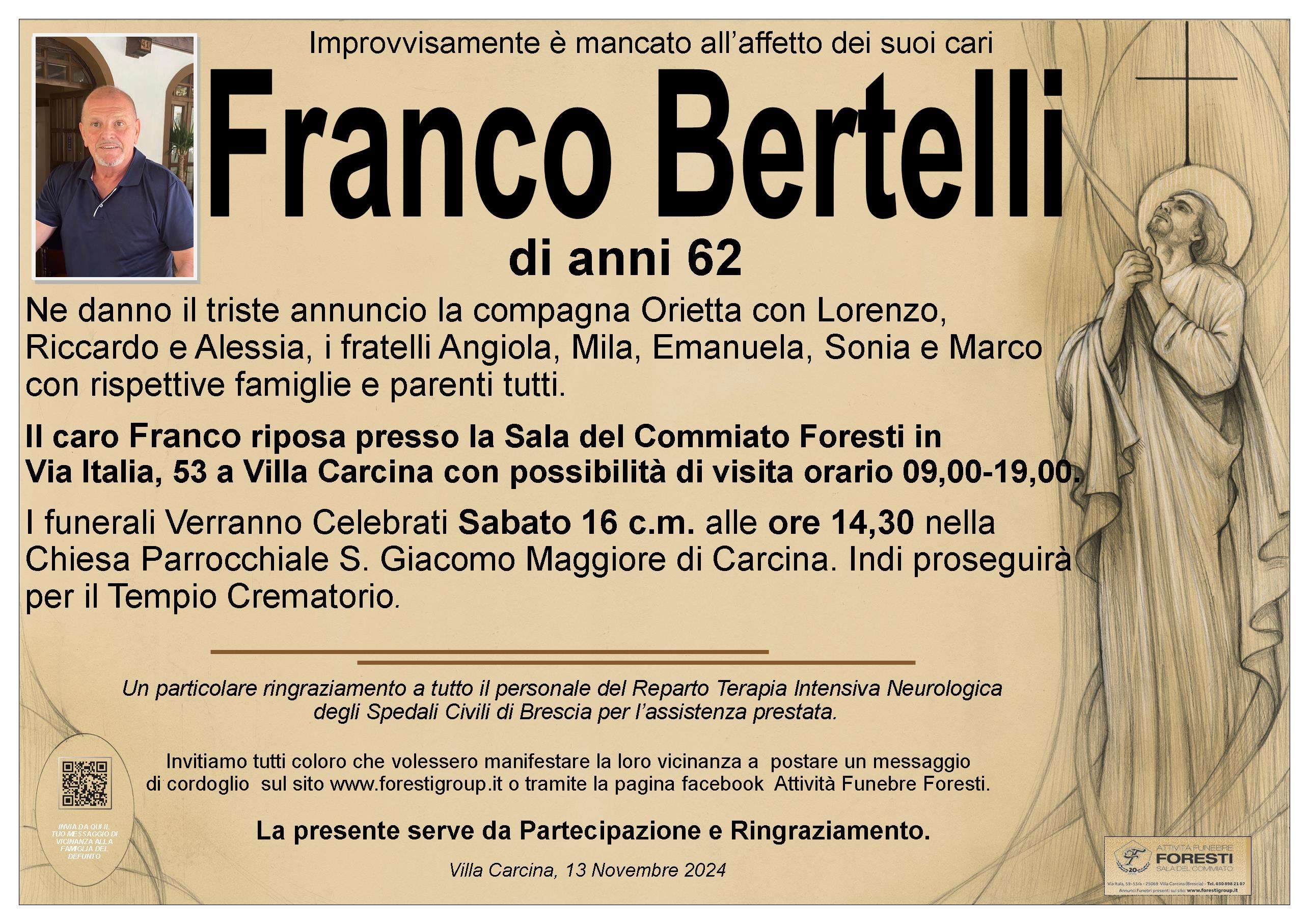 Con profondo sconforto apprendo la dipartita di Franco.. Alla sorella Emanuela e fratelli tutti con i familiari porgo il mio cordoglio. Vi abbraccio e vi sono vicina. Daniela Pini ???????????? Ponte Zanano Bs