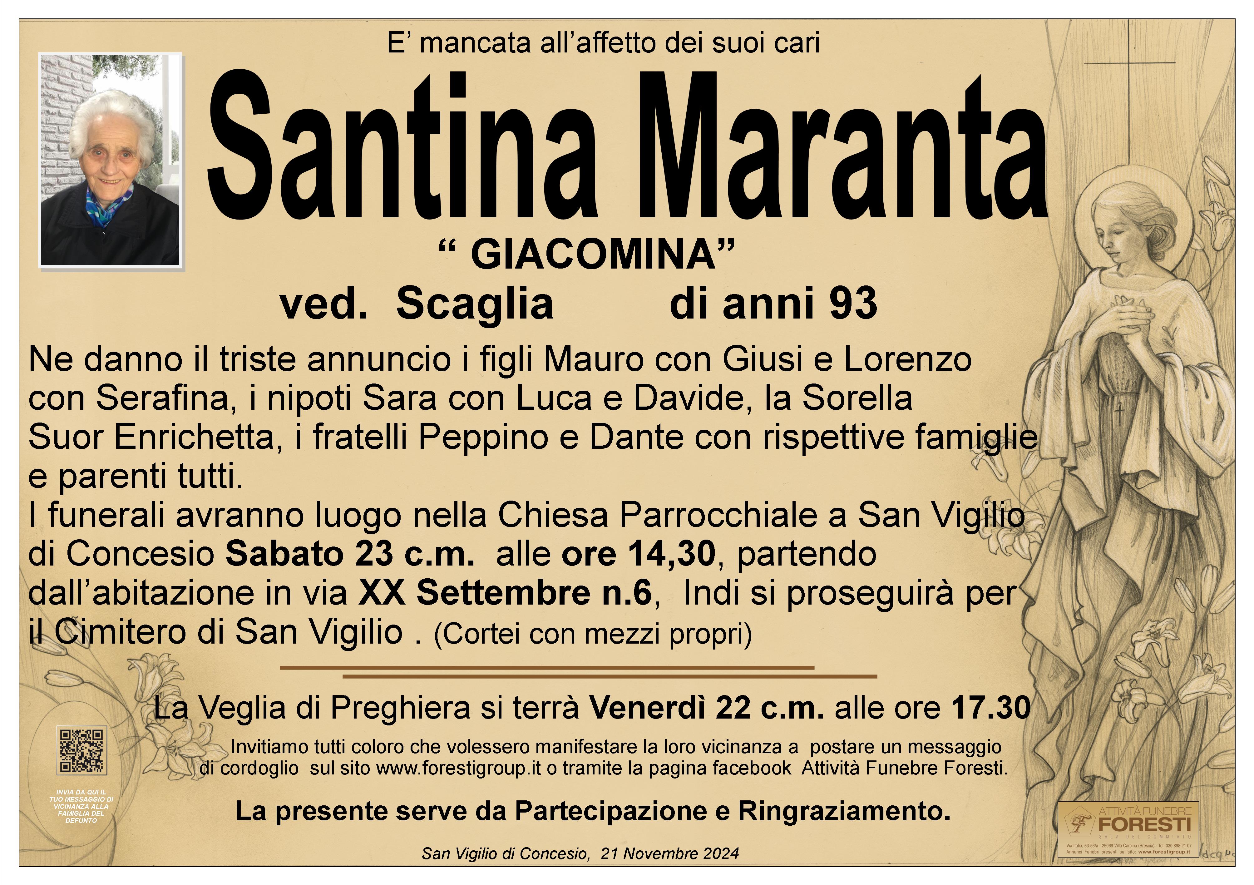 I FUNERALI VERRANNO CELEBRATI SABATO 23 C.M. ALLA ORE 14.30 NELLA CHIESA PARROCCHIALE DI SAN VIGILIO , SI PROSEGUIRA' PER IL CIMITERO ( CORTEI CON MEZZI PROPRI ).