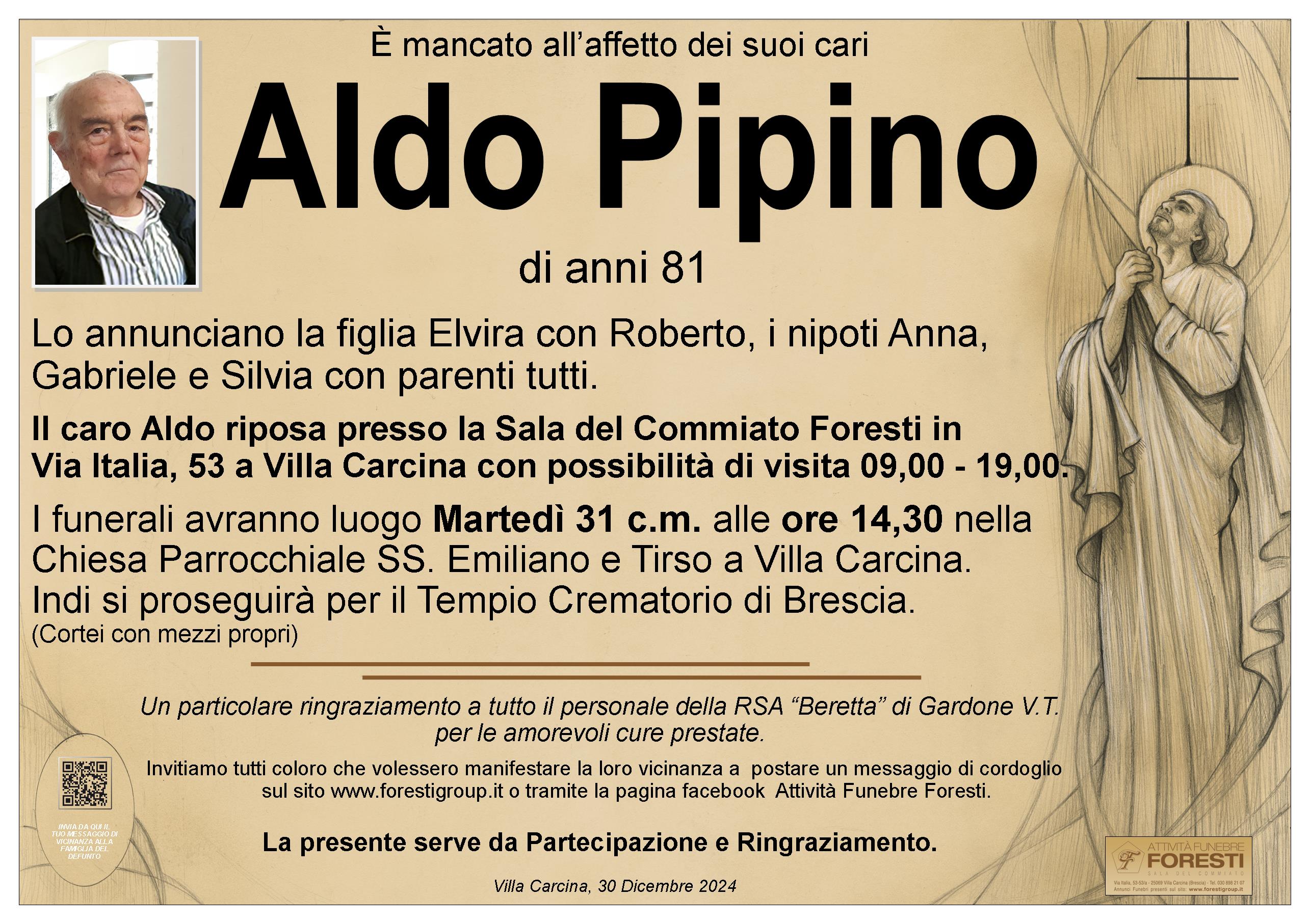 Il caro Aldo riposa presso la Sala del Commiato Foresti in Via Italia, 53 a Villa Carcina con possibilità di visita 09,00 - 19,00.
