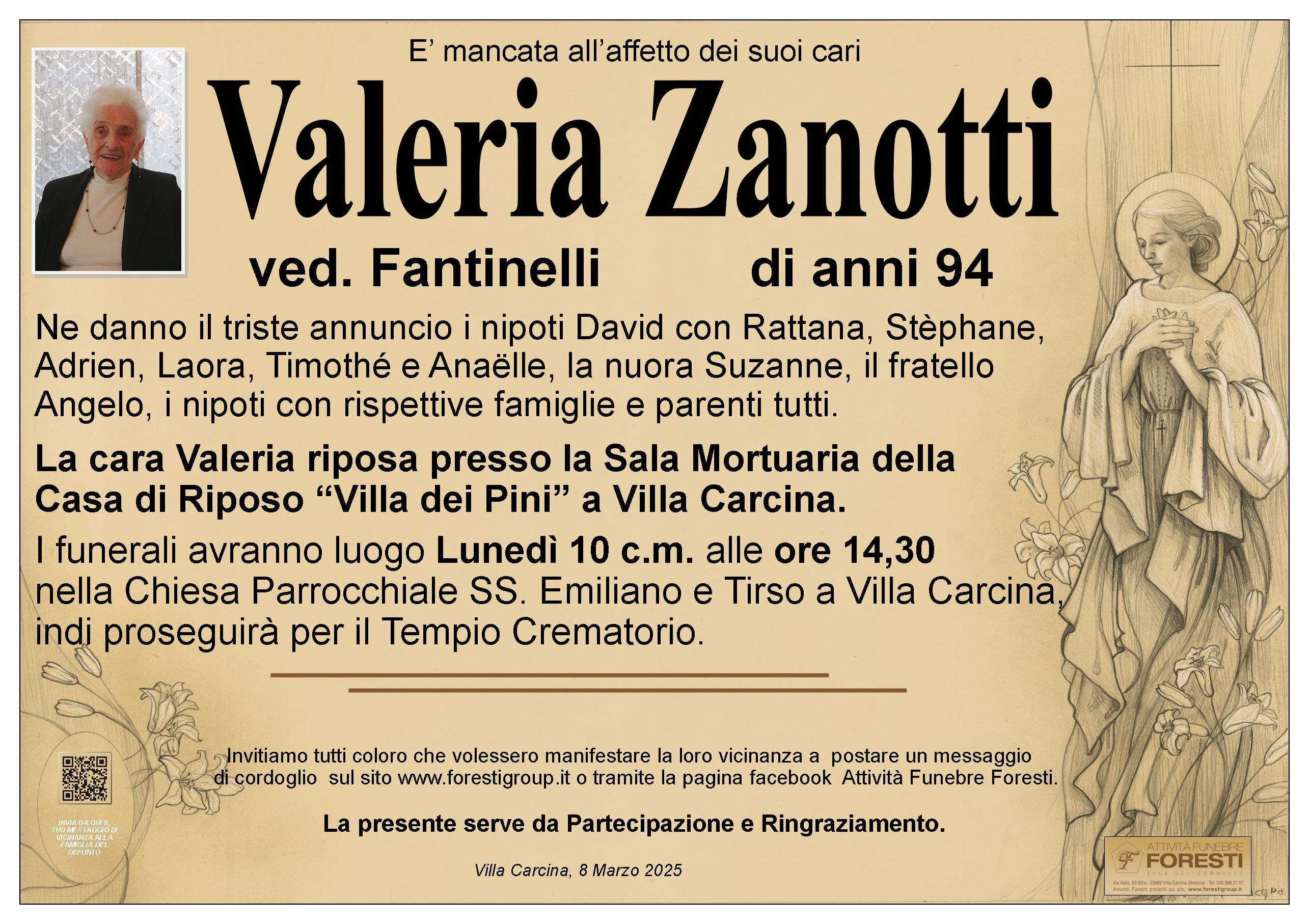 Sentite condoglianze per la morte di Valeria ai nipoti, alla nuora e al fratello Angelo dal cugino Enrico Zanotti e famiglia.