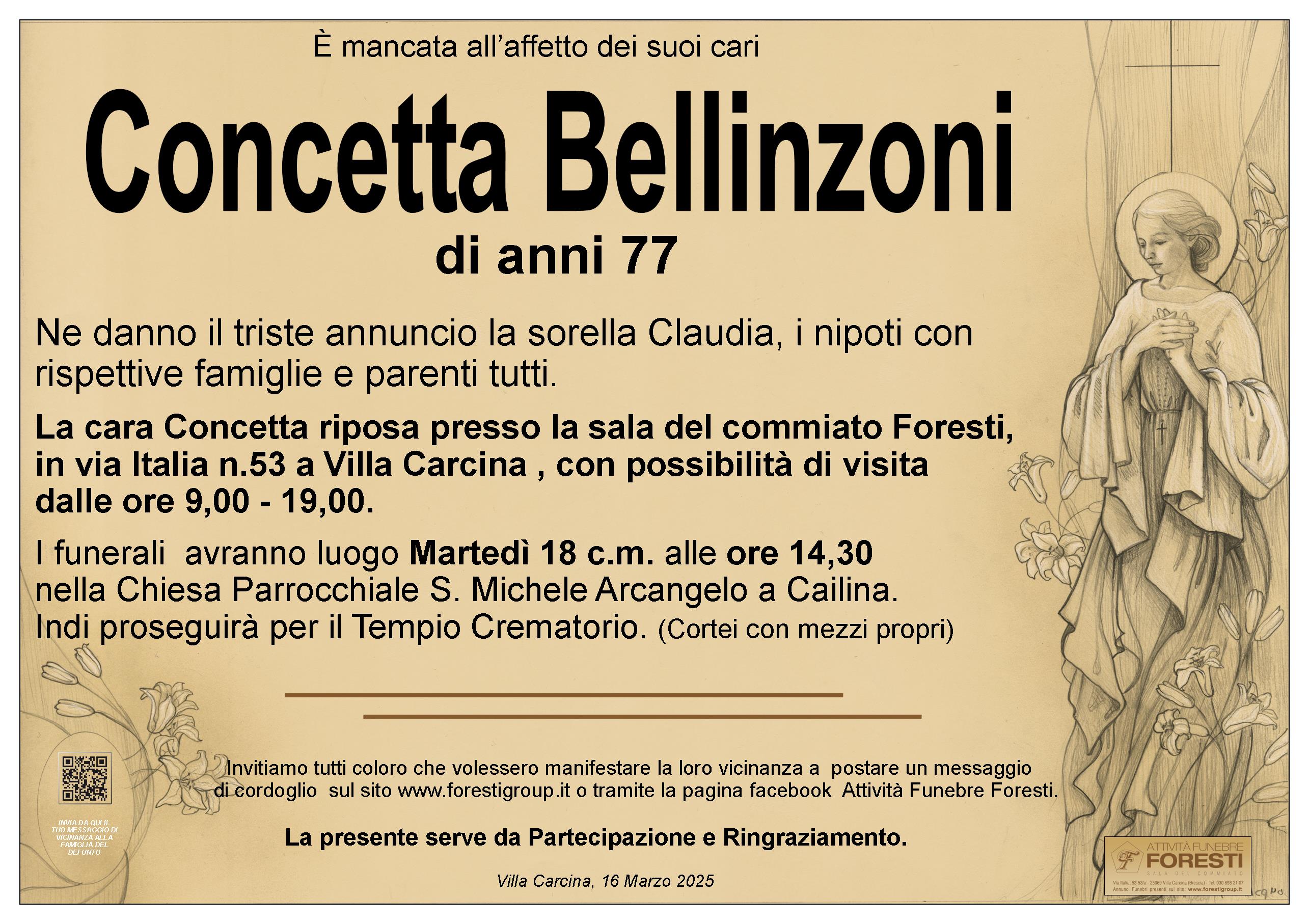 La cara Concetta riposa presso la sala del commiato Foresti, in via Italia n.53 a Villa Carcina , con possibilità di visita dalle ore 9,00 - 19,00.