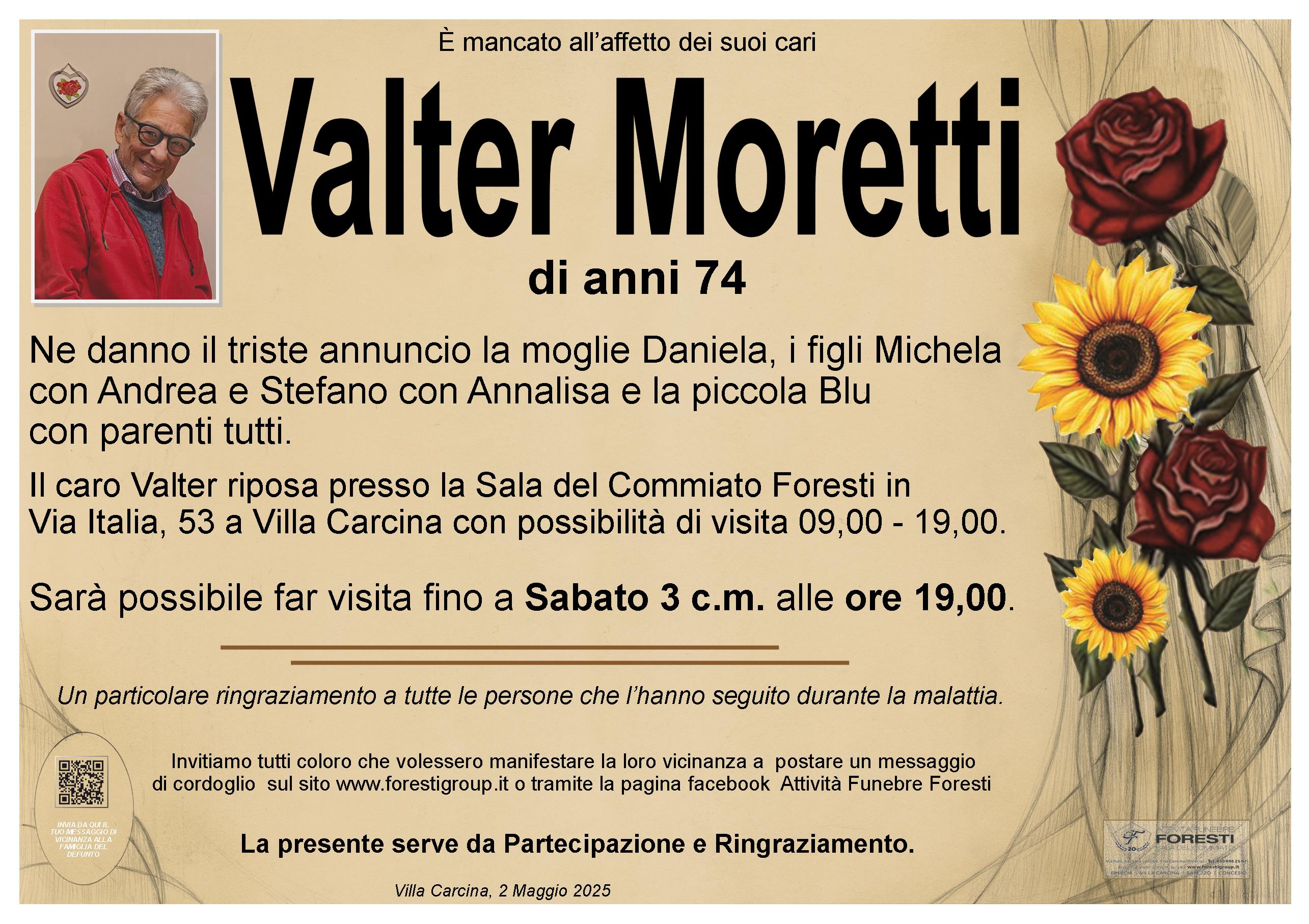 Il caro Valter riposa presso la Sala del Commiato Foresti in Via Italia, 53 a Villa Carcina con possibilità di visita 09,00 - 19,00.