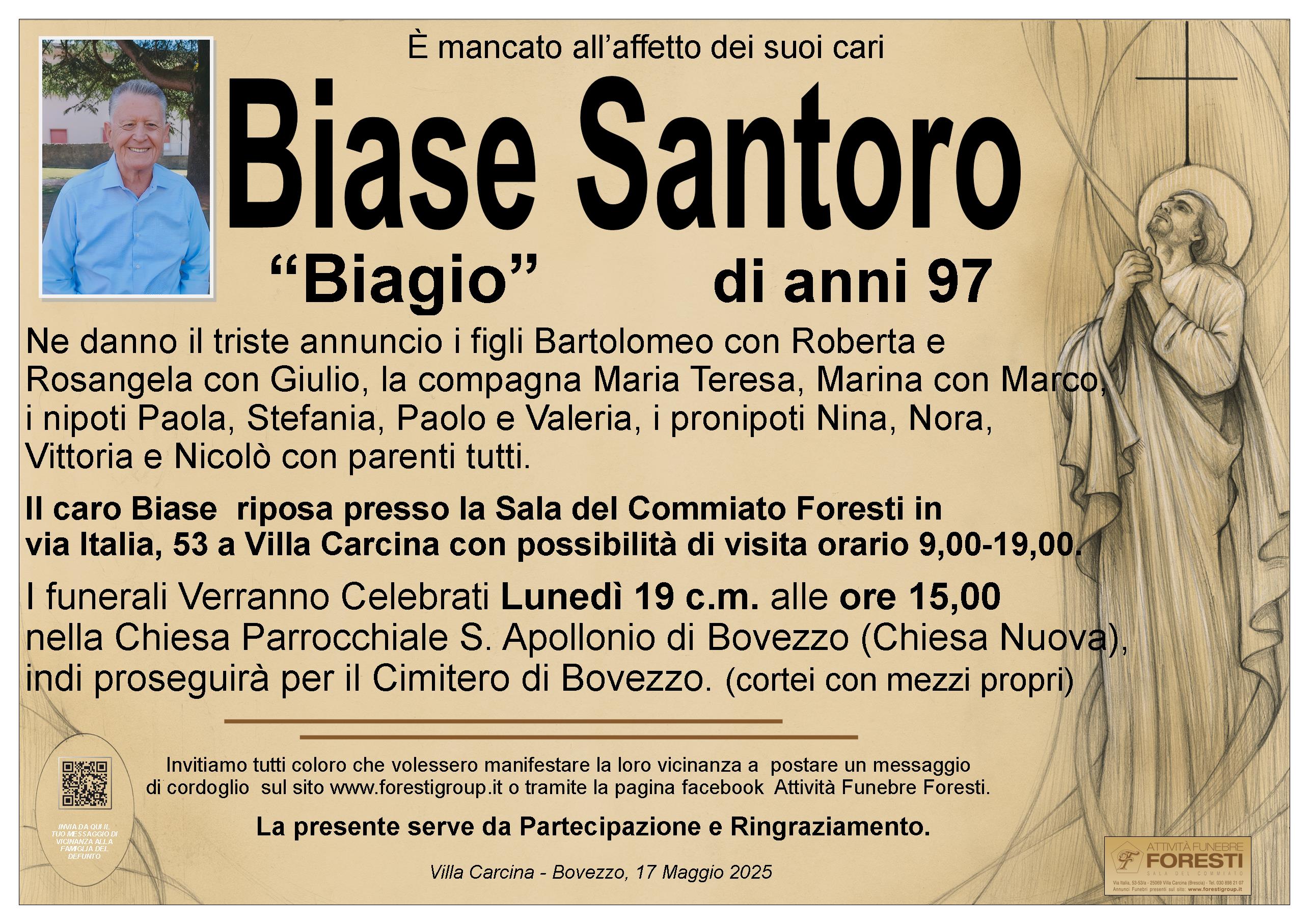 Il caro Biase riposa presso la Sala del Commiato Foresti in via Italia, 53 a Villa Carcina con possibilità di visita orario 9,00-19,00.