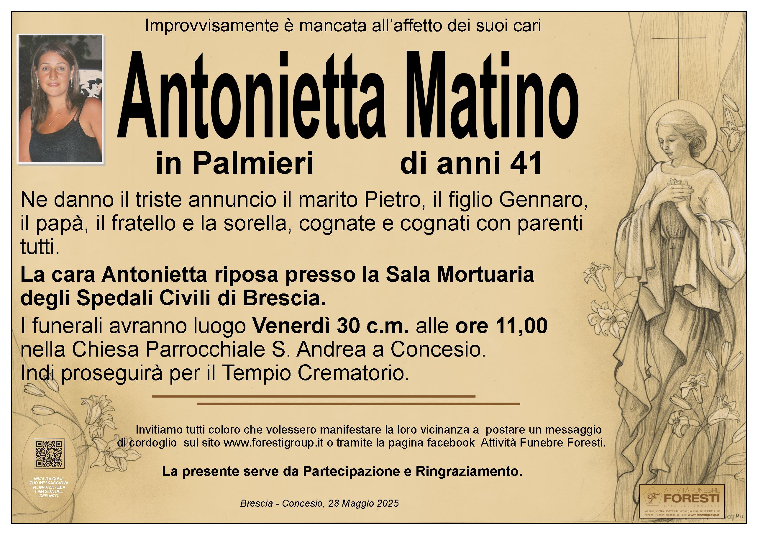 La cara Antonietta riposa presso la Sala Mortuaria degli Spedali Civili di Brescia.