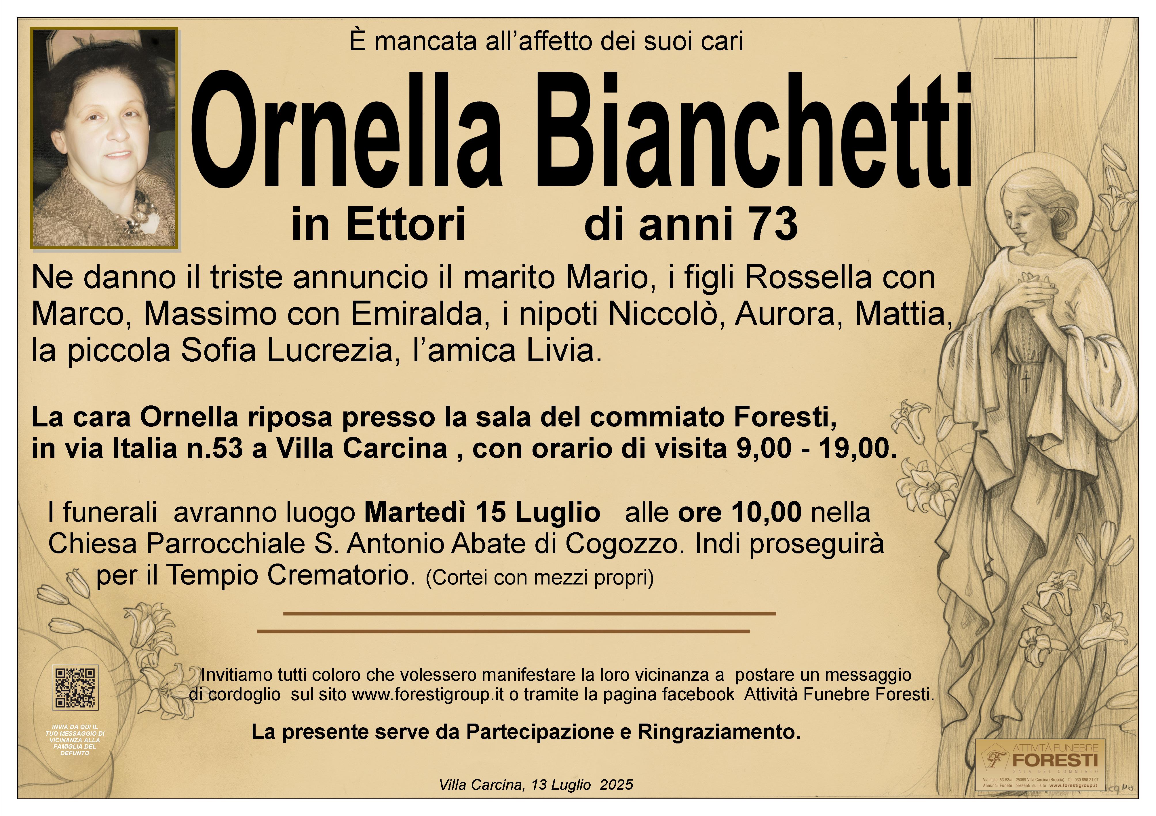 Siamo vicini in questo triste momento a Mattia al nonno Mario a Massimo Emiralda e familiari tutti per la perdita della cara Ornella. Sara e famiglia