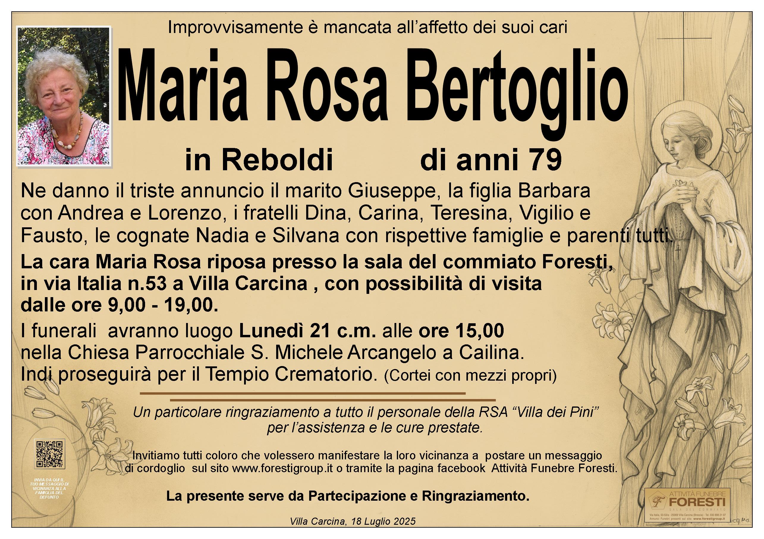La cara Maria Rosa riposa presso la sala del commiato Foresti, in via Italia n.53 a Villa Carcina , con possibilità di visita dalle ore 9,00 - 19,00.