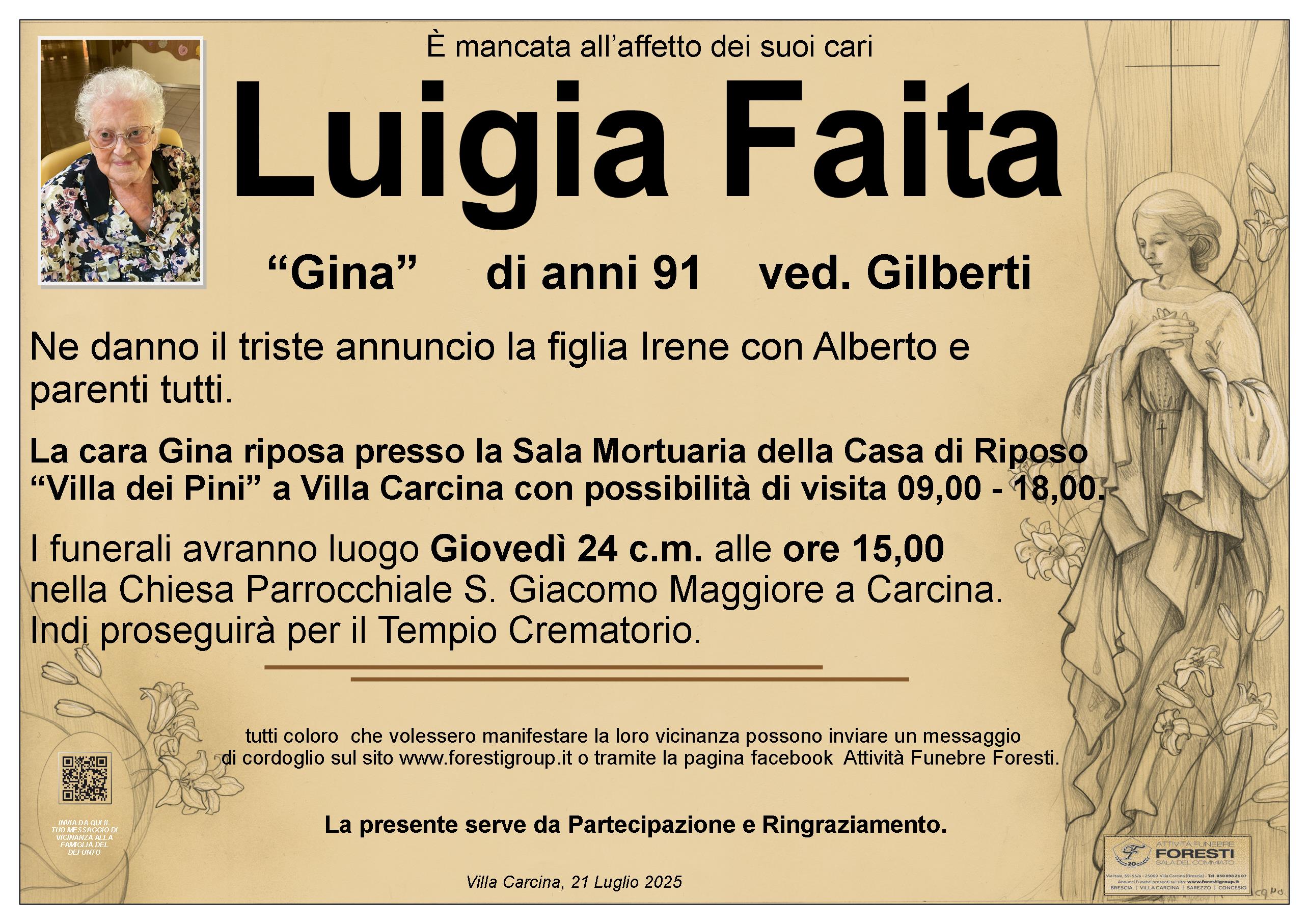 I funerali avranno luogo Giovedì 24 c.m. alle ore 15,00 nella Chiesa Parrocchiale S. Giacomo Maggiore a Carcina. Indi proseguirà per il Tempio Crematorio.