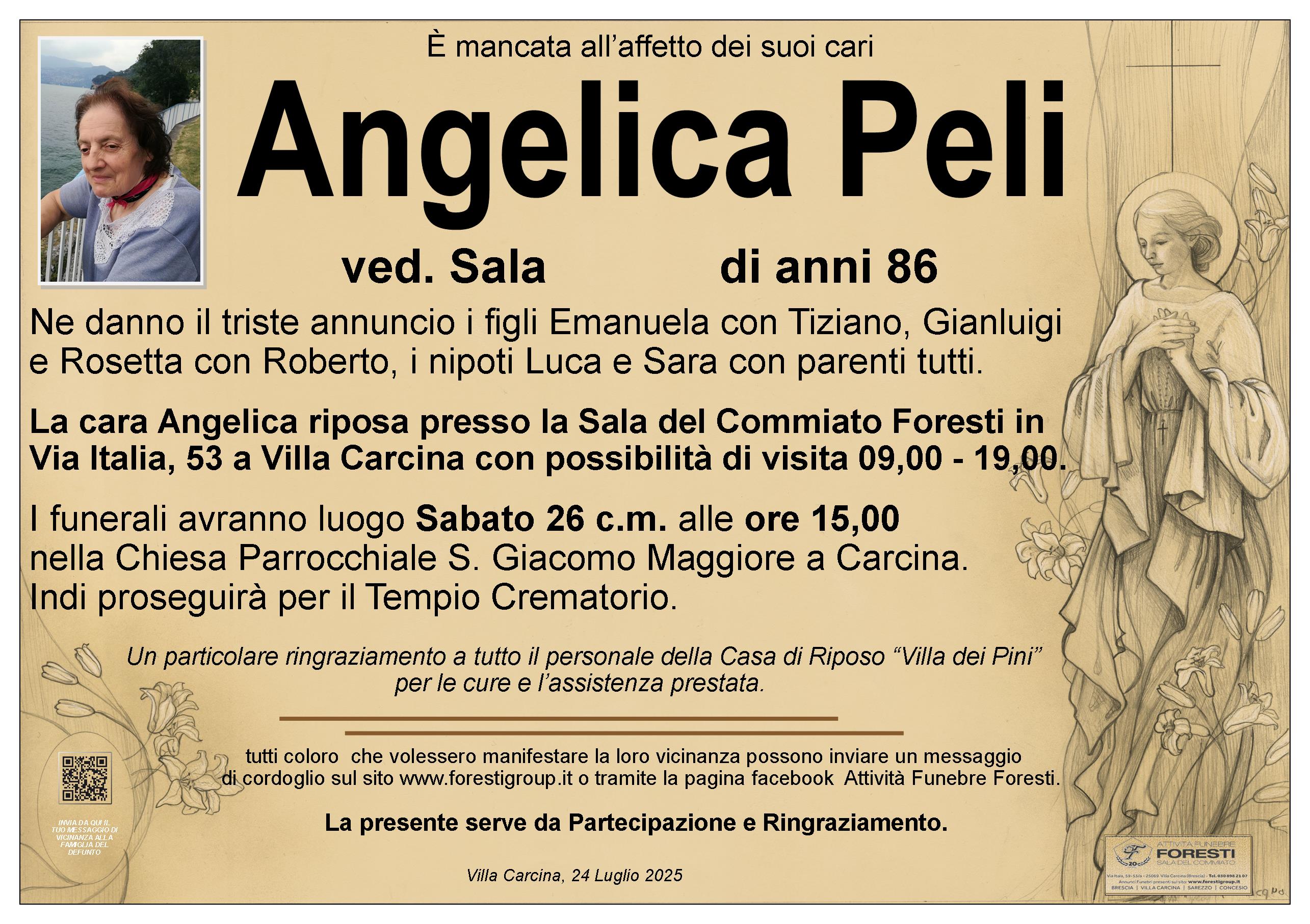 La cara Angelica riposa presso la Sala del Commiato Foresti in Via Italia, 53 a Villa Carcina con possibilità di visita 09,00 - 19,00.