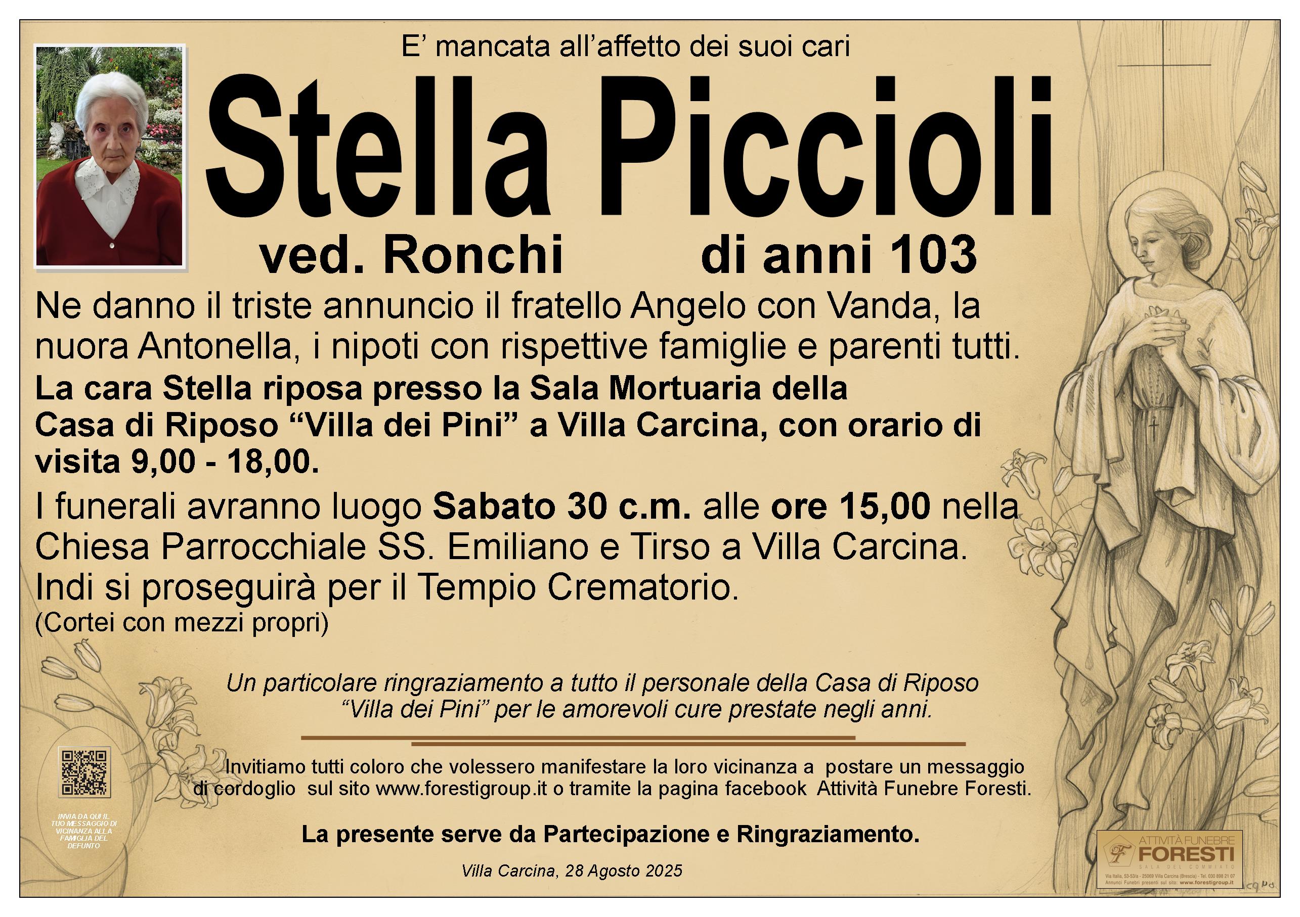 La cara Stella riposa presso la Sala Mortuaria della Casa di Riposo “Villa dei Pini” a Villa Carcina, con orario di visita 9,00 - 18,00.