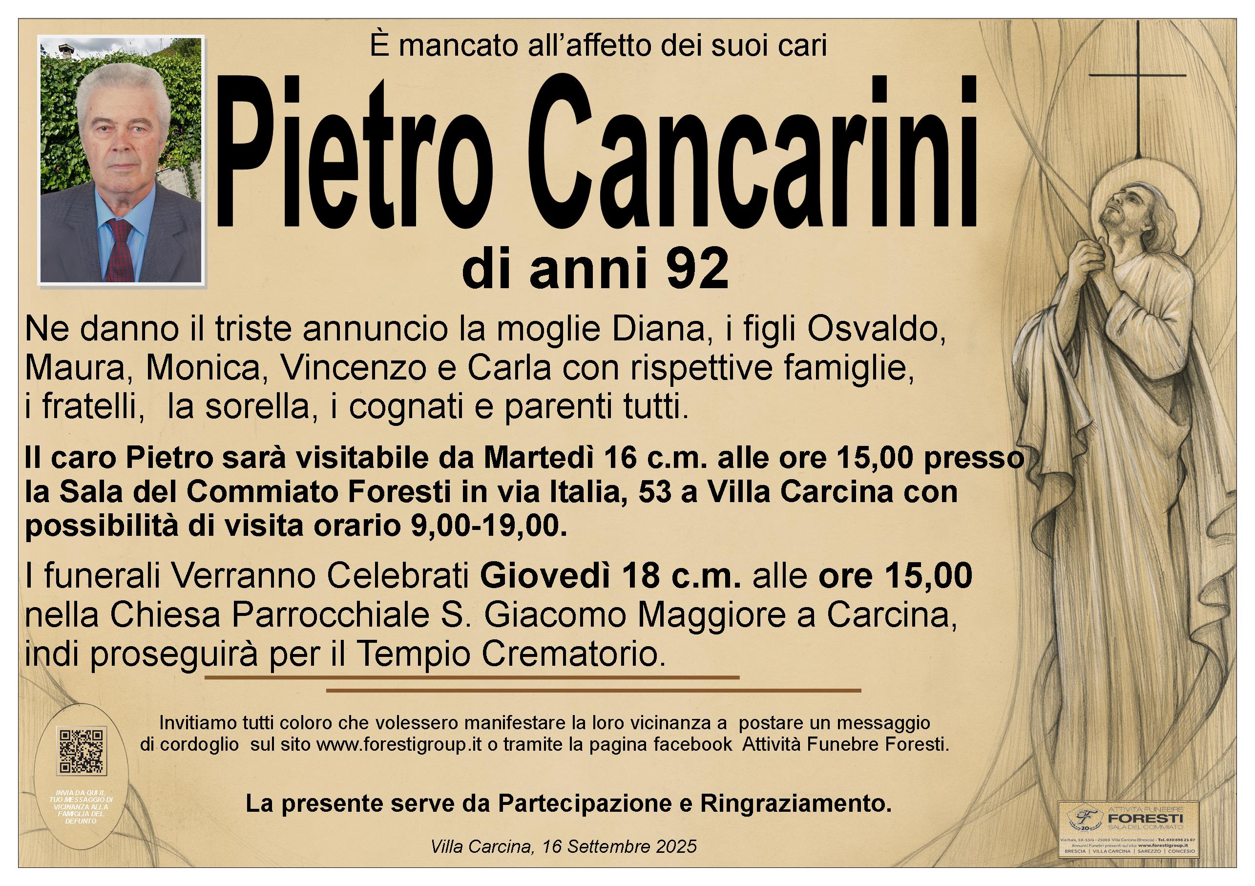 Il caro Pietro sarà visitabile da Martedì 16 c.m. alle ore 15,00 presso la Sala del Commiato Foresti in via Italia, 53 a Villa Carcina con possibilità di visita orario 9,00-19,00.