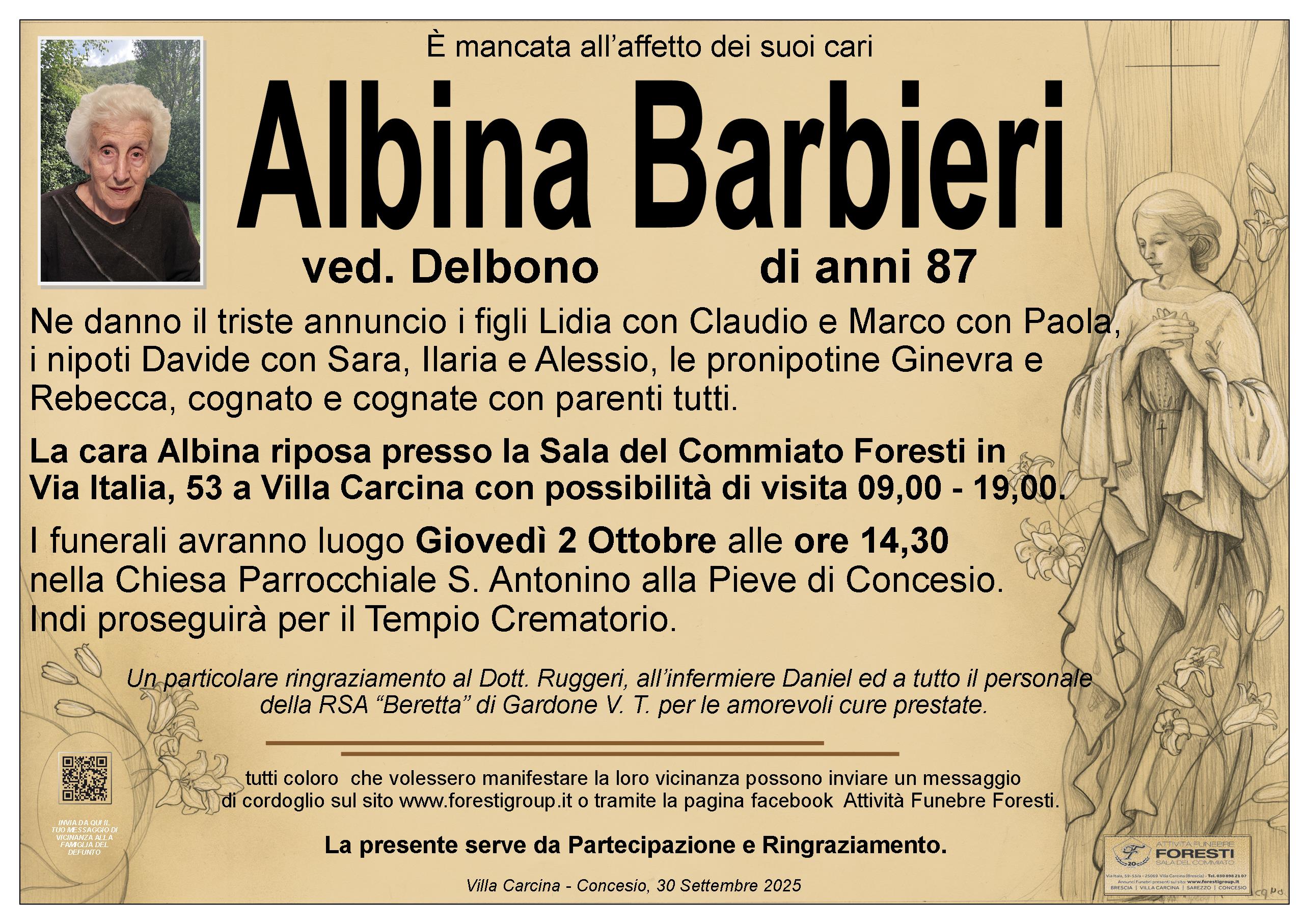 La cara Albina riposa presso la Sala del Commiato Foresti in Via Italia, 53 a Villa Carcina con possibilità di visita 09,00 - 19,00.