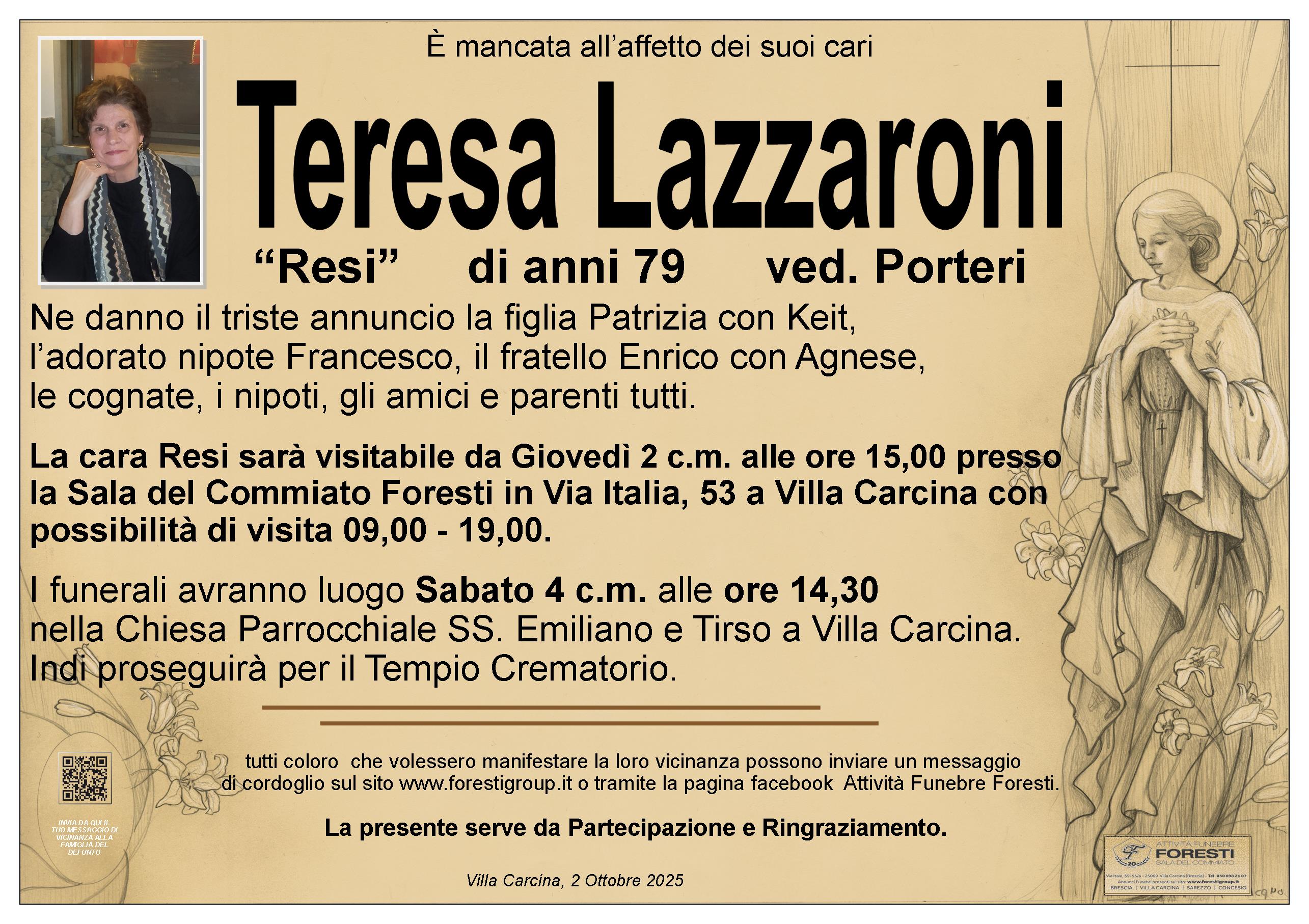 La cara Resi sarà visitabile da Giovedì 2 c.m. alle ore 15,00 presso la Sala del Commiato Foresti in Via Italia, 53 a Villa Carcina con possibilità di visita 09,00 - 19,00.