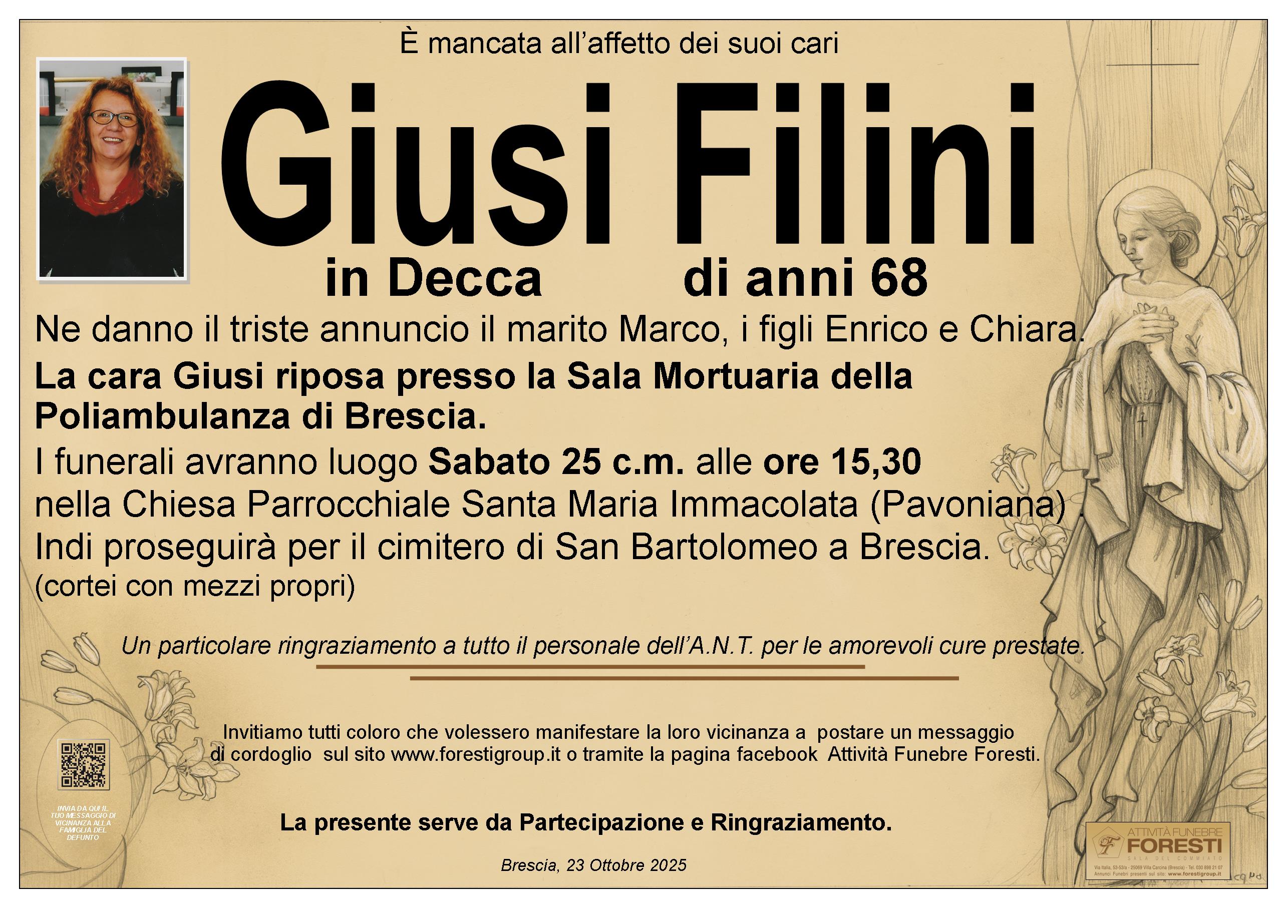 I funerali avranno luogo Sabato 25 c.m. alle ore 15,30 nella Chiesa Parrocchiale Santa Maria Immacolata (Pavoniana) . Indi proseguirà per il cimitero di San Bartolomeo a Brescia.