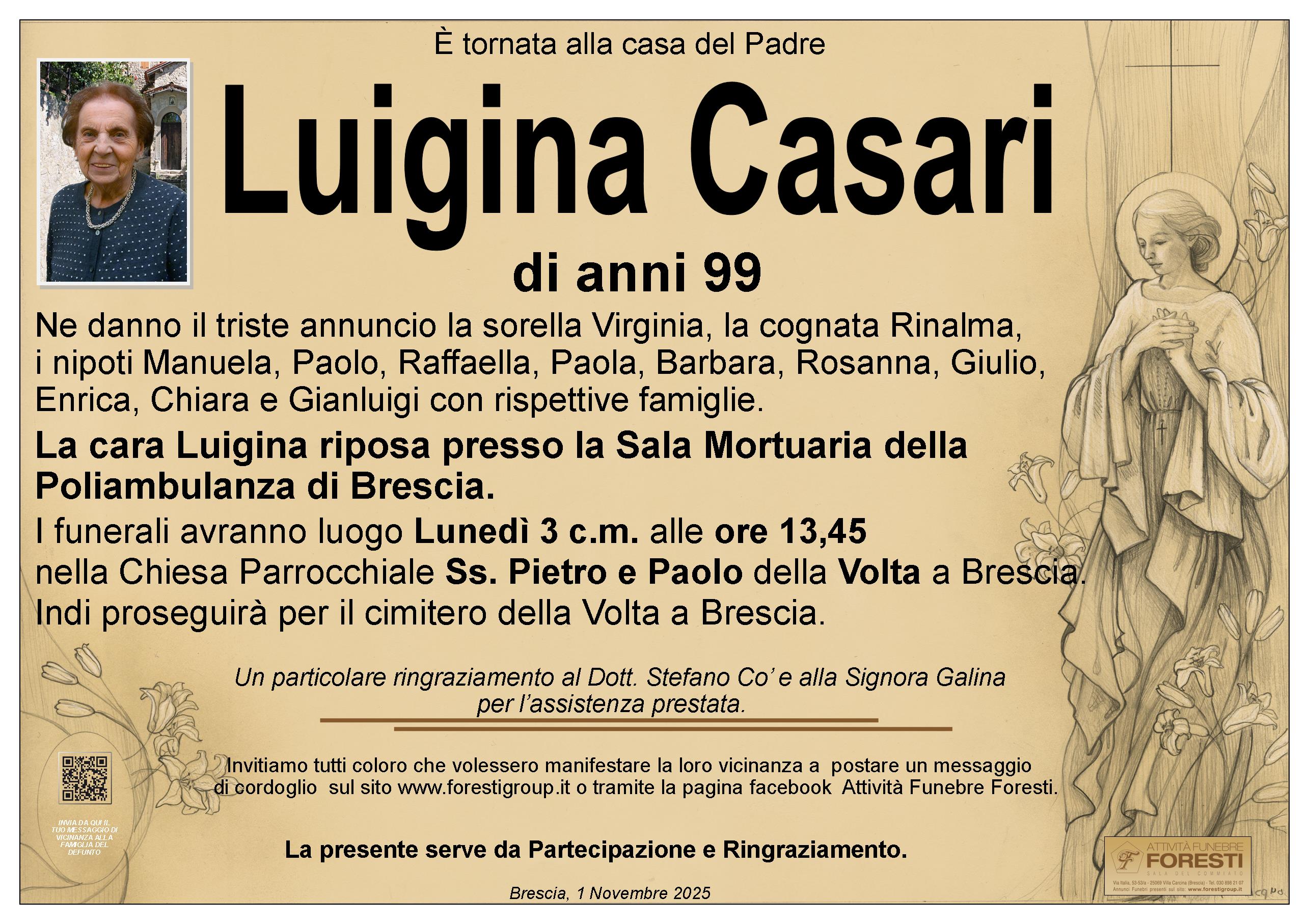 I funerali avranno luogo Lunedì 3 c.m. alle ore 13,45 nella Chiesa Parrocchiale Ss. Pietro e Paolo della Volta a Brescia. Indi proseguirà per il cimitero della Volta a Brescia.