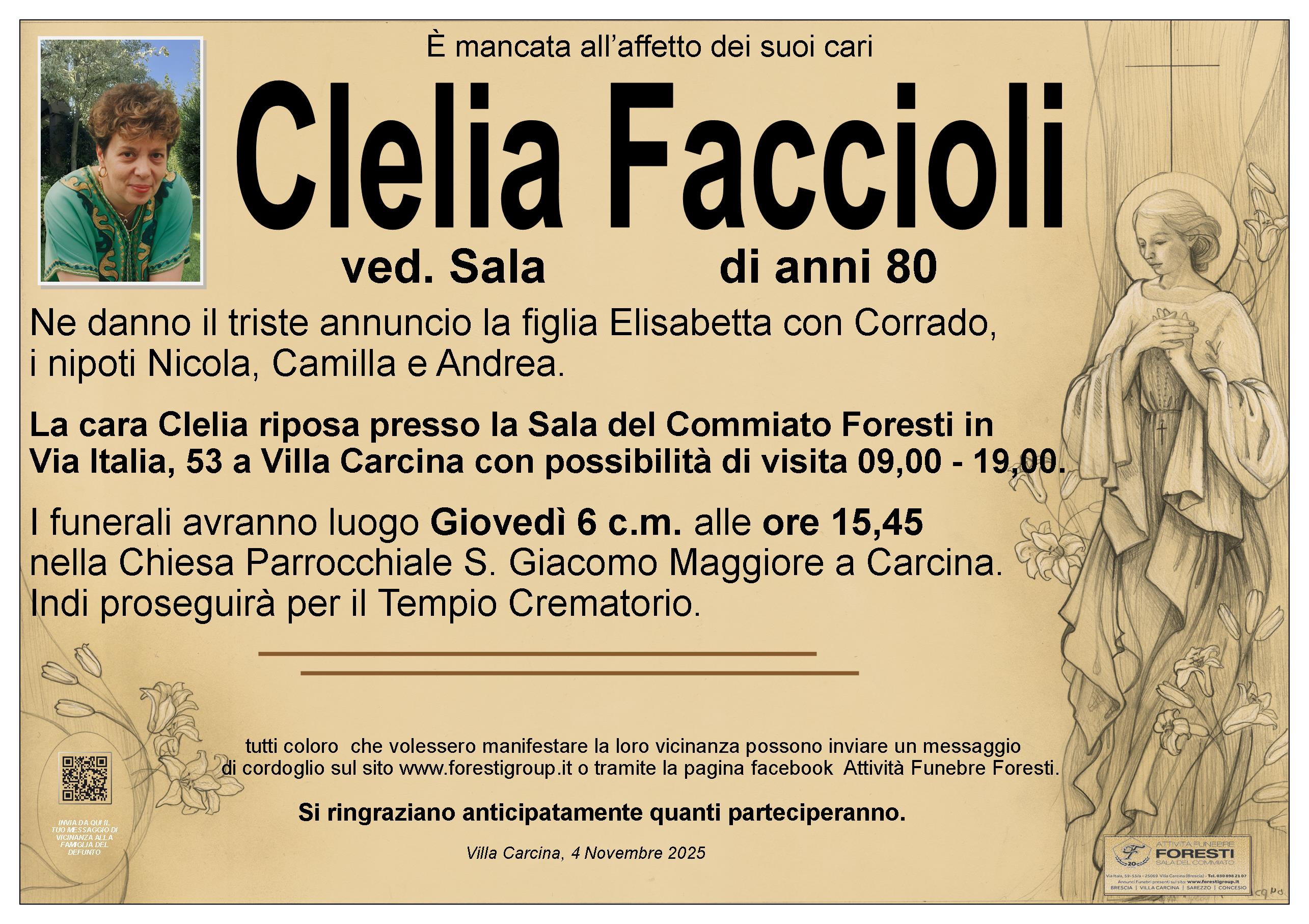 La cara Clelia riposa presso la Sala del Commiato Foresti in Via Italia, 53 a Villa Carcina con possibilità di visita 09,00 - 19,00.