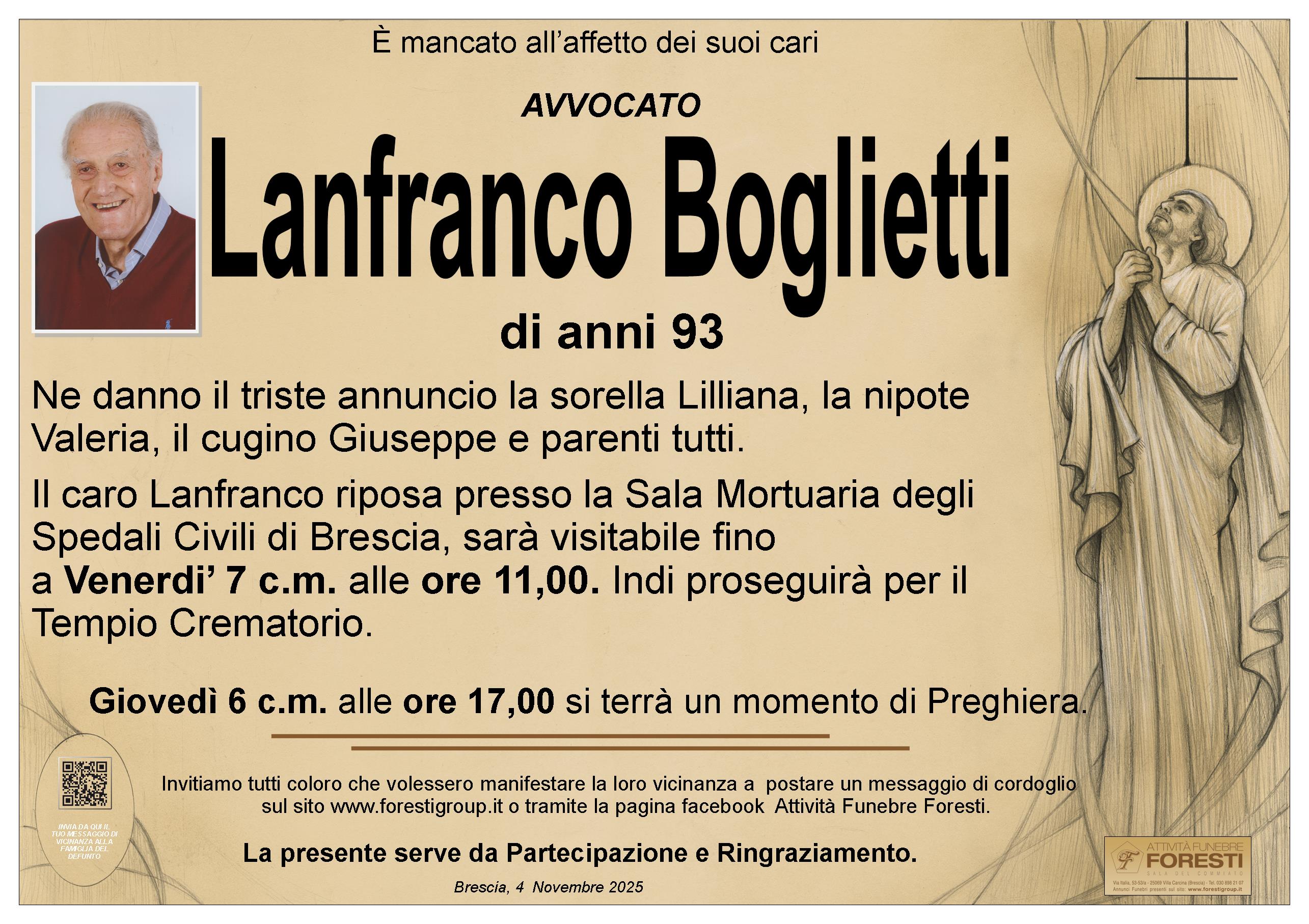 Il caro Lanfranco riposa presso la Sala Mortuaria degli Spedali Civili di Brescia, dove Giovedì 6 c.m. alle ore 17,00 si terrà un momento di Preghiera, sarà visitabile fino a Venerdi’ 7 c.m. alle ore 11,00.