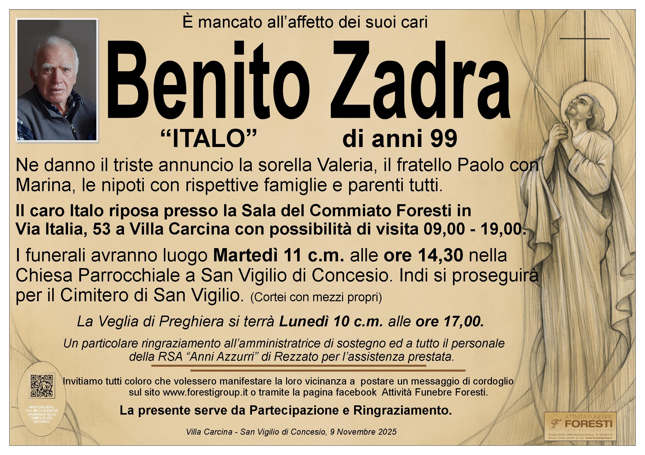 I funerali avranno luogo Martedì 11 c.m. alle ore 14,30 nella Chiesa Parrocchiale a San Vigilio di Concesio. Indi si proseguirà per il Cimitero di San Vigilio. (Cortei con mezzi propri)