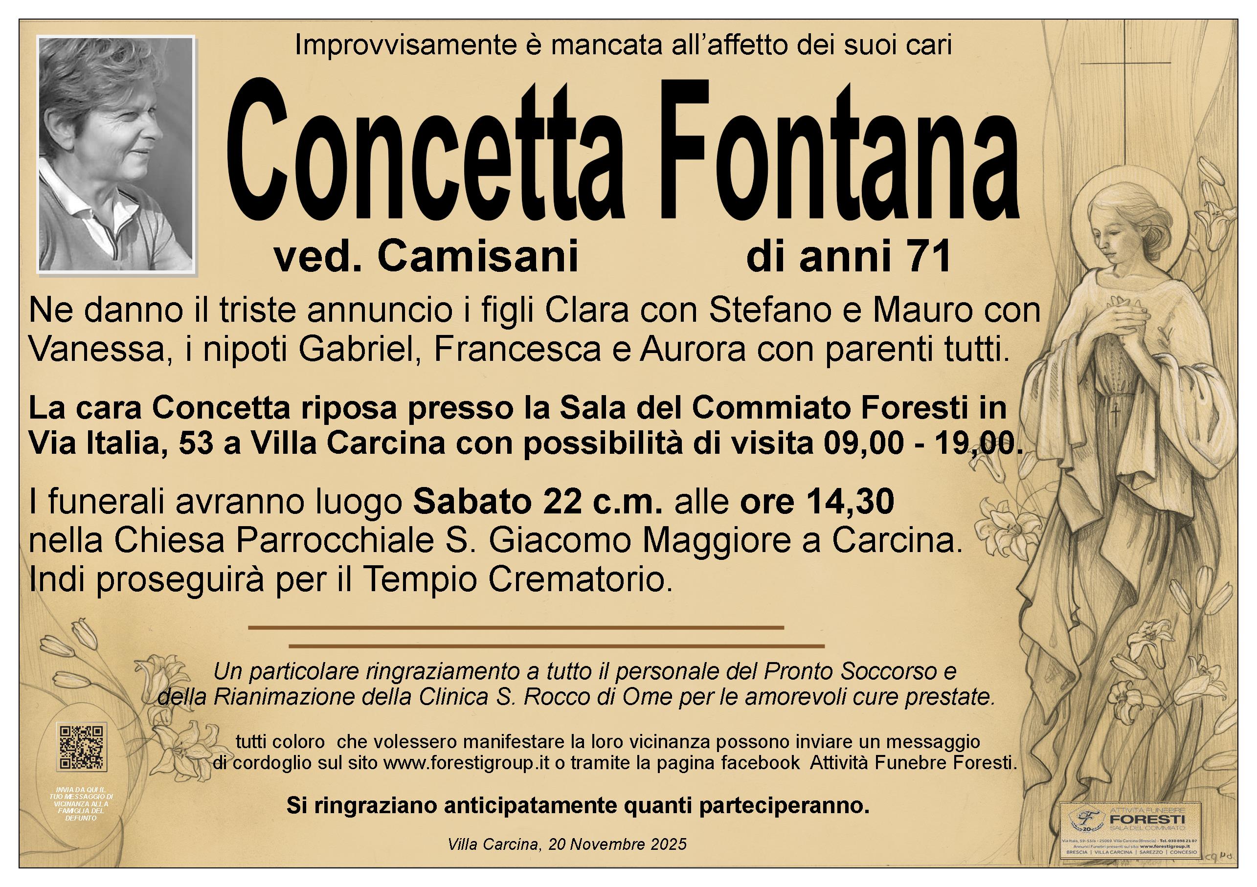 La cara Concetta riposa presso la Sala del Commiato Foresti in Via Italia, 53 a Villa Carcina con possibilità di visita 09,00 - 19,00.