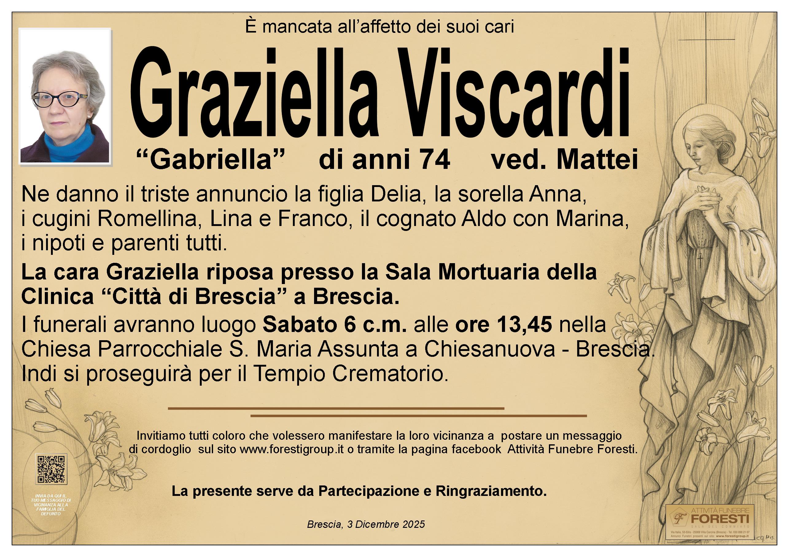 La cara Graziella riposa presso la Sala Mortuaria della Clinica “Città di Brescia” a Brescia.