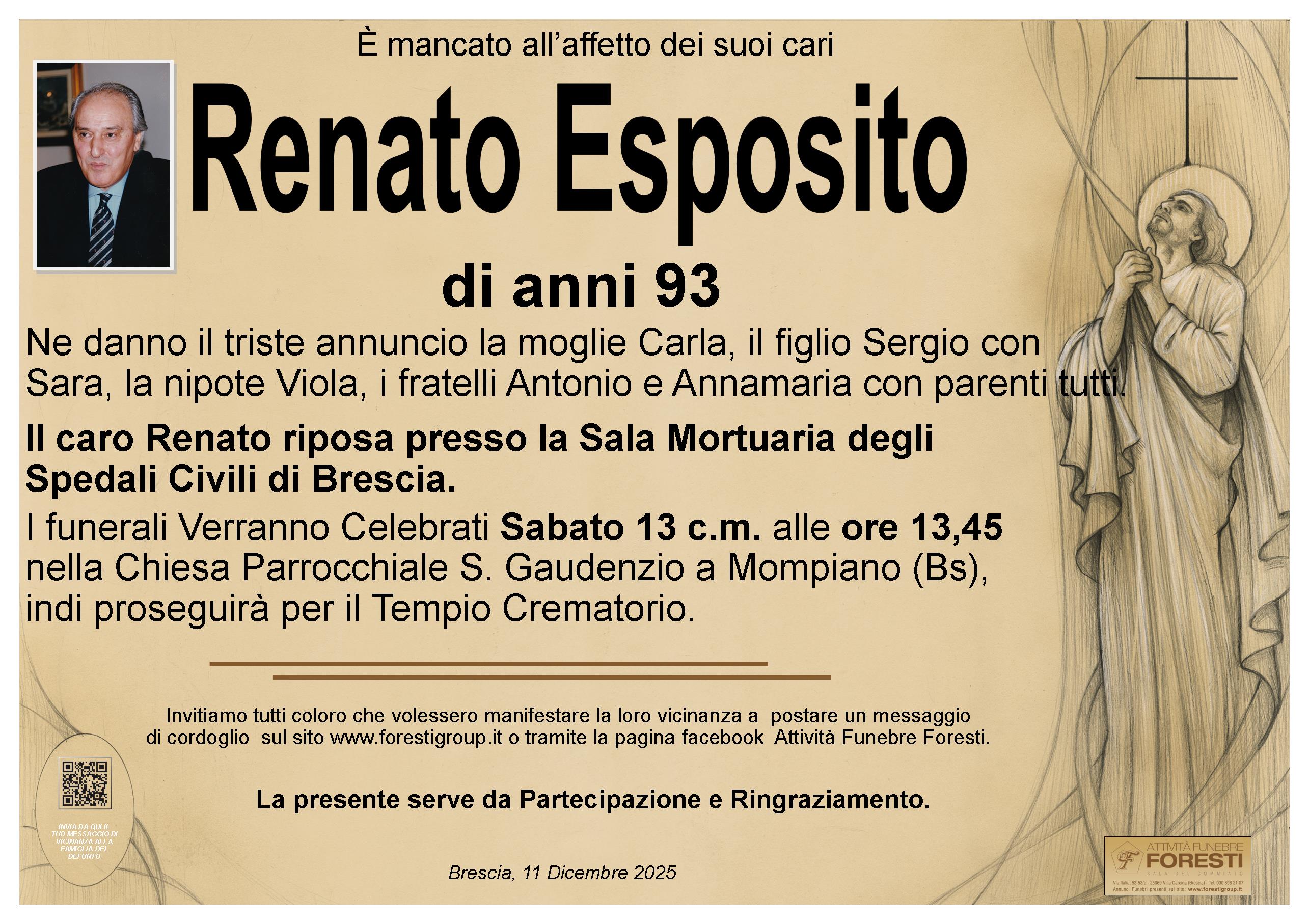 Il caro Renato riposa presso la Sala Mortuaria degli Spedali Civili di Brescia.