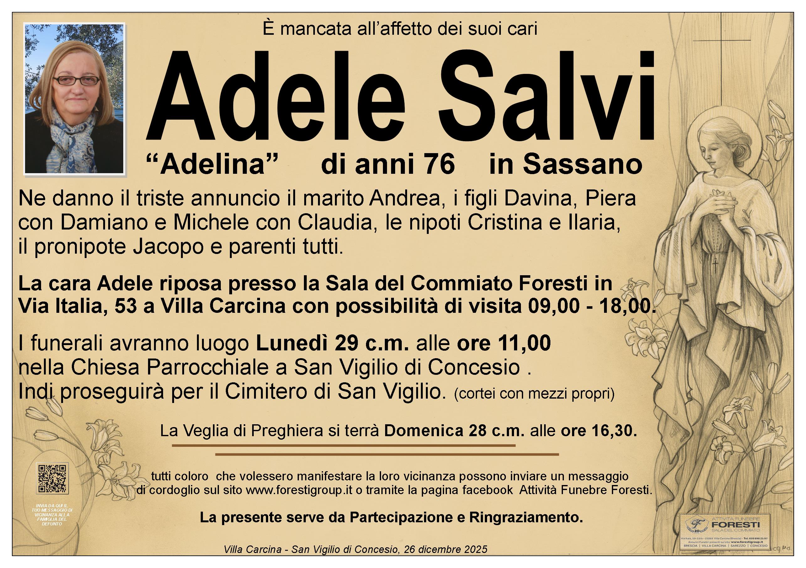 La cara Adele riposa presso la Sala del Commiato Foresti in Via Italia, 53 a Villa Carcina con possibilità di visita 09,00 - 18,00.