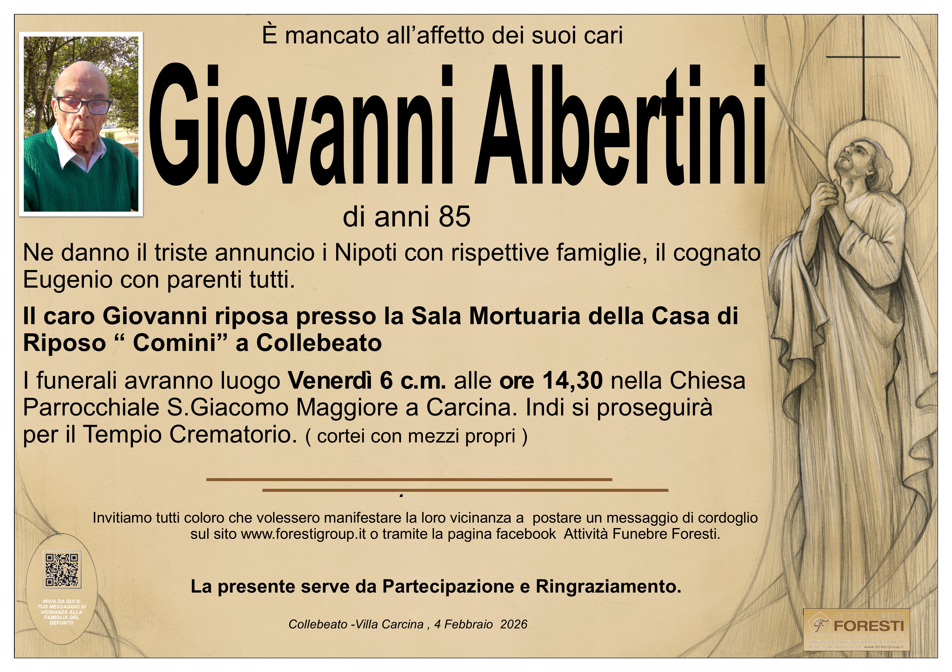 Porgo sentite condoglianze a Cristina e familiari ricordando Giovanni nella preghiera. Un abbraccio,, Daniela e Dante Crescini.