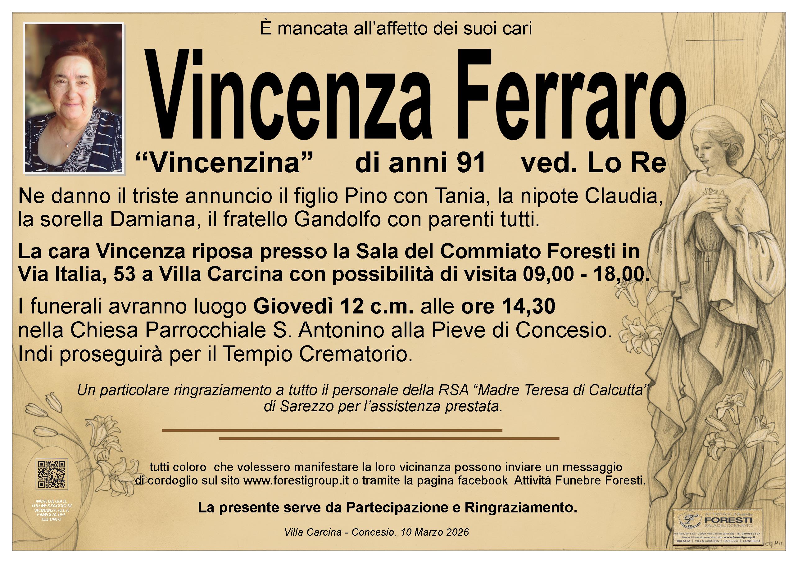 La cara Vincenza riposa presso la Sala del Commiato Foresti in Via Italia, 53 a Villa Carcina con possibilità di visita 09,00 - 18,00.