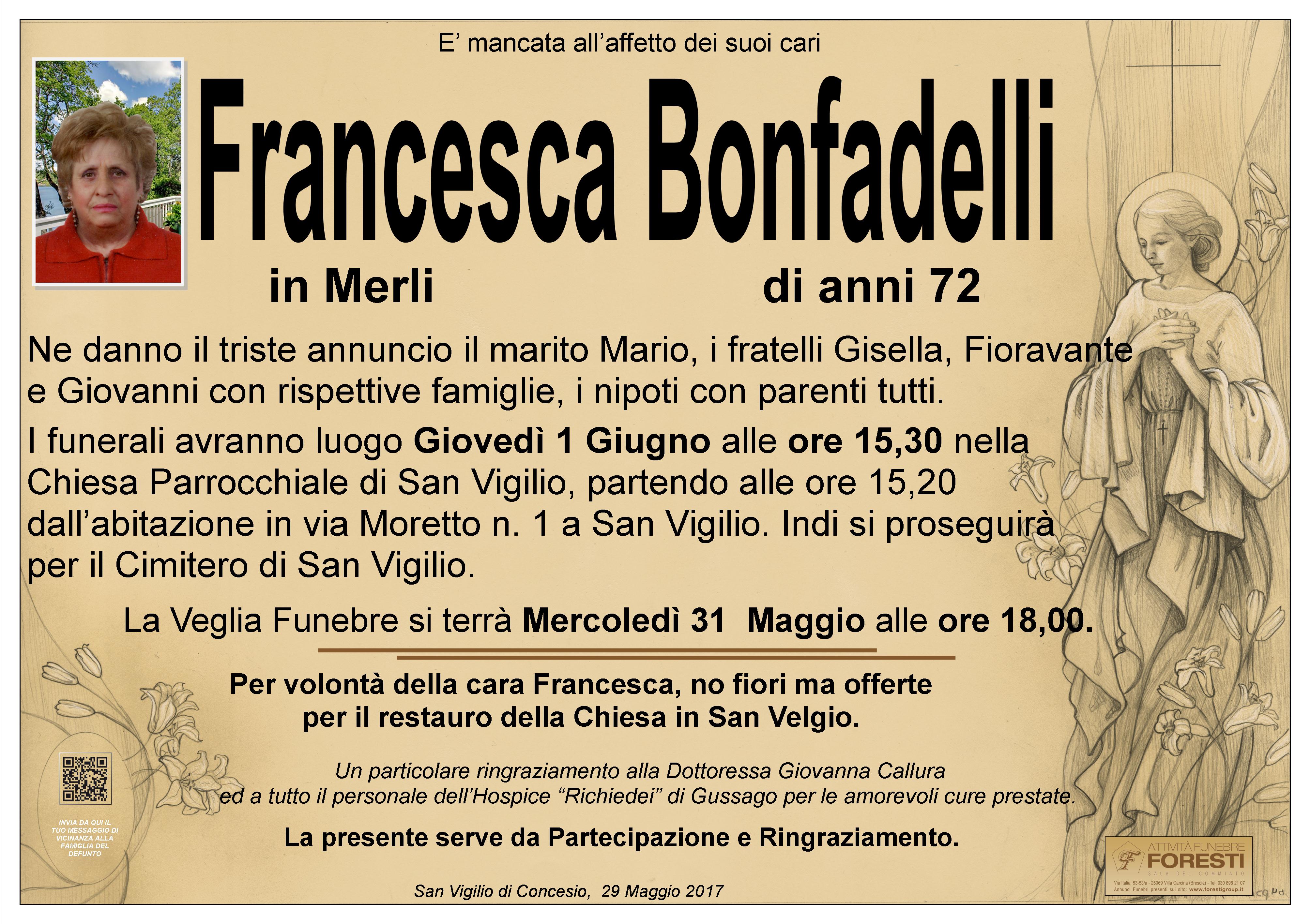 GIOVEDI' 1 GIUGNO ALLE ORE 15.30 VERRANNO CELEBRATE LE ESEQUIE NELLA CHIESA PARROCCHIALE DI SAN VIGILIO E GREGORIO MAGNO,