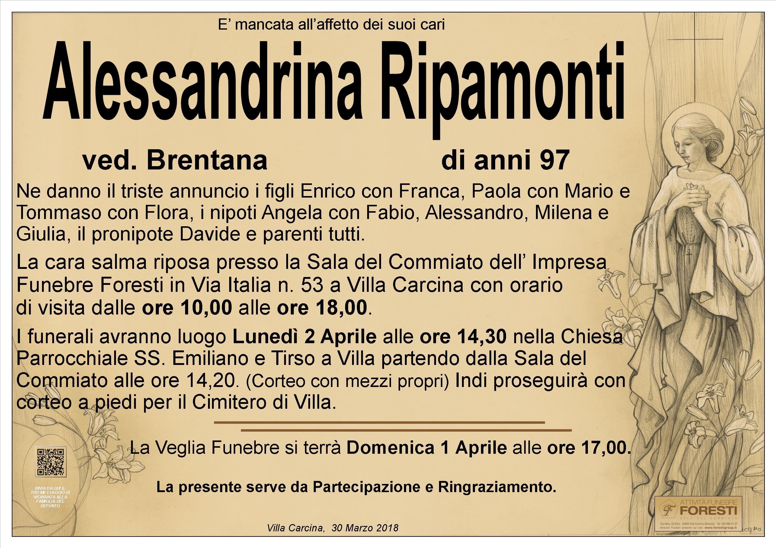 LA CARA ALESSANDRINA RIPOSA PRESSO LA SALA DEL COMMIATO DELL'IMPRESA FUNEBRE FORESTI CON ORARIO DI VISITA CONTINUATO DALLE ORE 10,00 ALLE ORE 18,00.