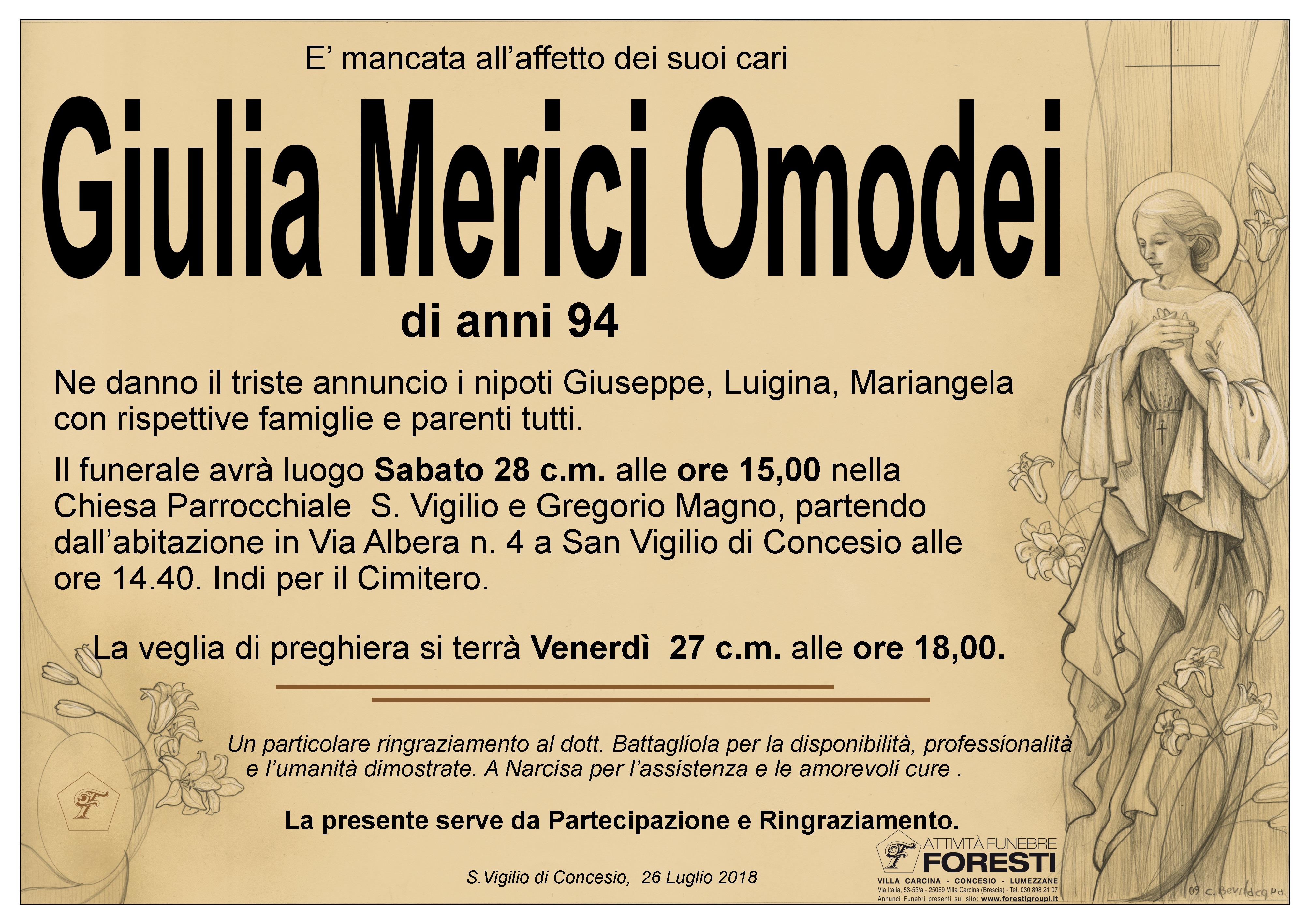 SABATO 28 C. M. ALLE ORE 15.00 VERRANNO CELEBRATI I FUNERALI NELLA CHIESA PARROCCHIALE DI SAN. VIGILIO E GREGORIO MAGNO.