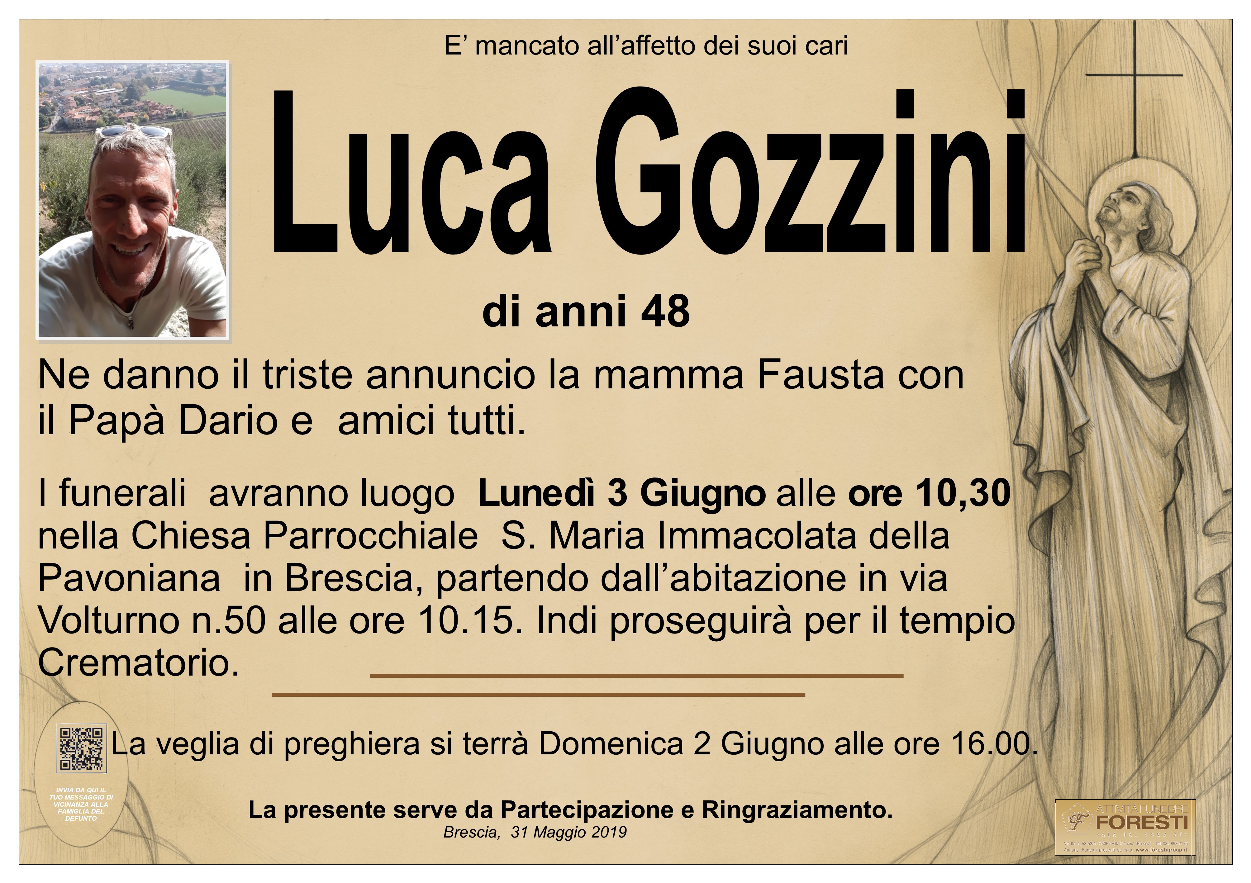Il caro Luca riposa presso l'abitazione in via Volturno n.50 a Brescia