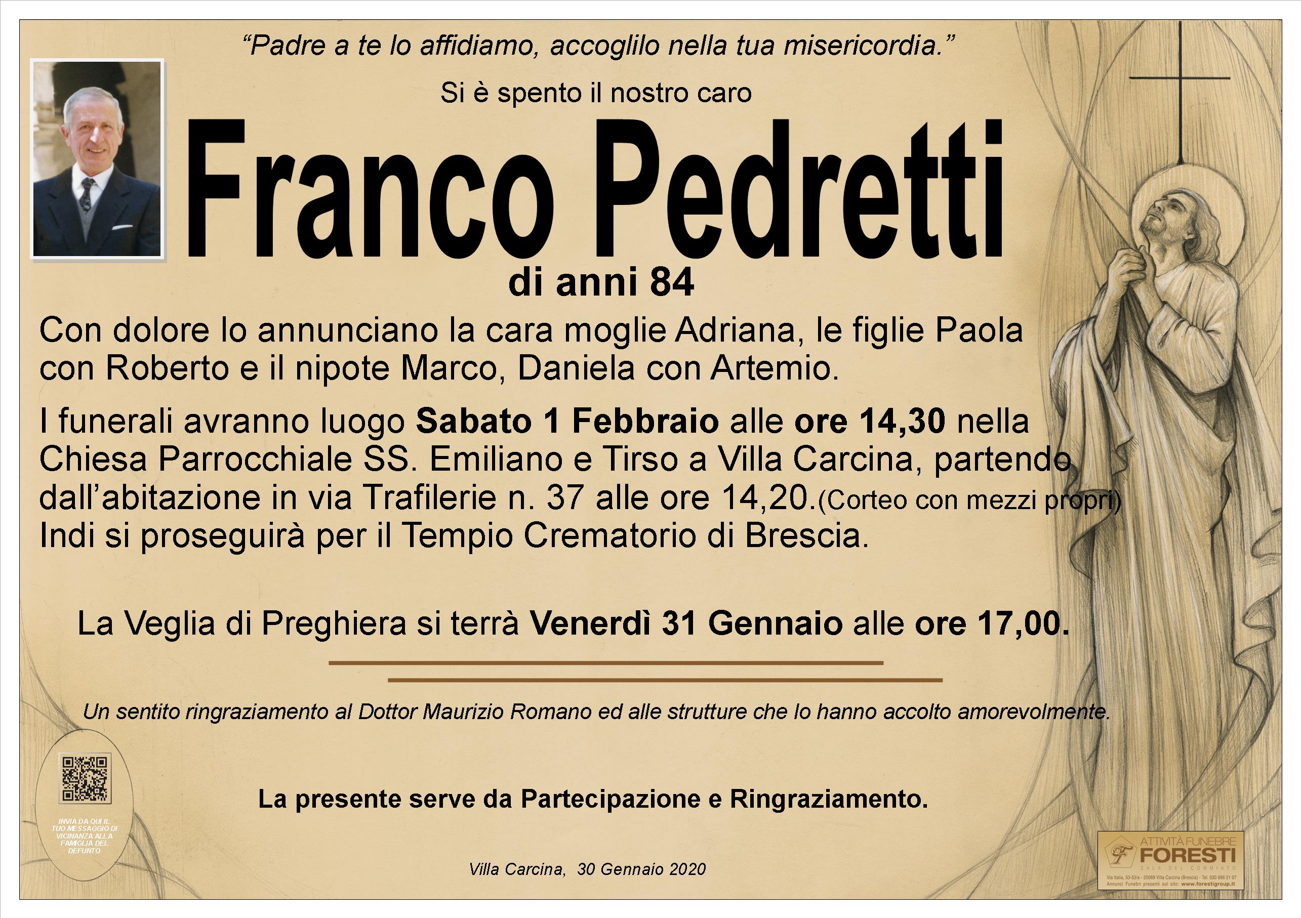 I funerali avranno luogo Sabato 1 Febbraio alle ore 14,30 nella Chiesa Parrocchiale SS. Emiliano e Tirso a Villa Carcina,partendo dall’abitazione alle ore 14,20.(Corteo con mezzi propri)