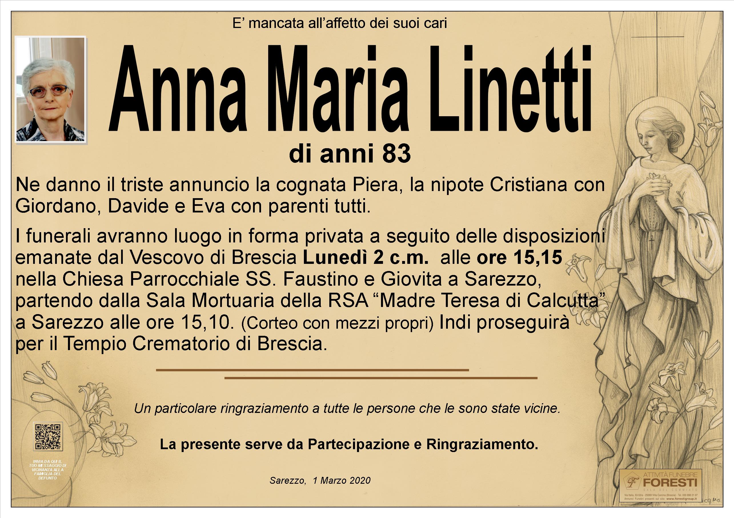 I funerali avranno luogo in forma privata a seguito delle disposizioni emanate dal Vescovo di Brescia Lunedì 2 c.m. alle ore 15,15 nella Chiesa Parrocchiale SS. Faustino e Giovita a Sarezzo.