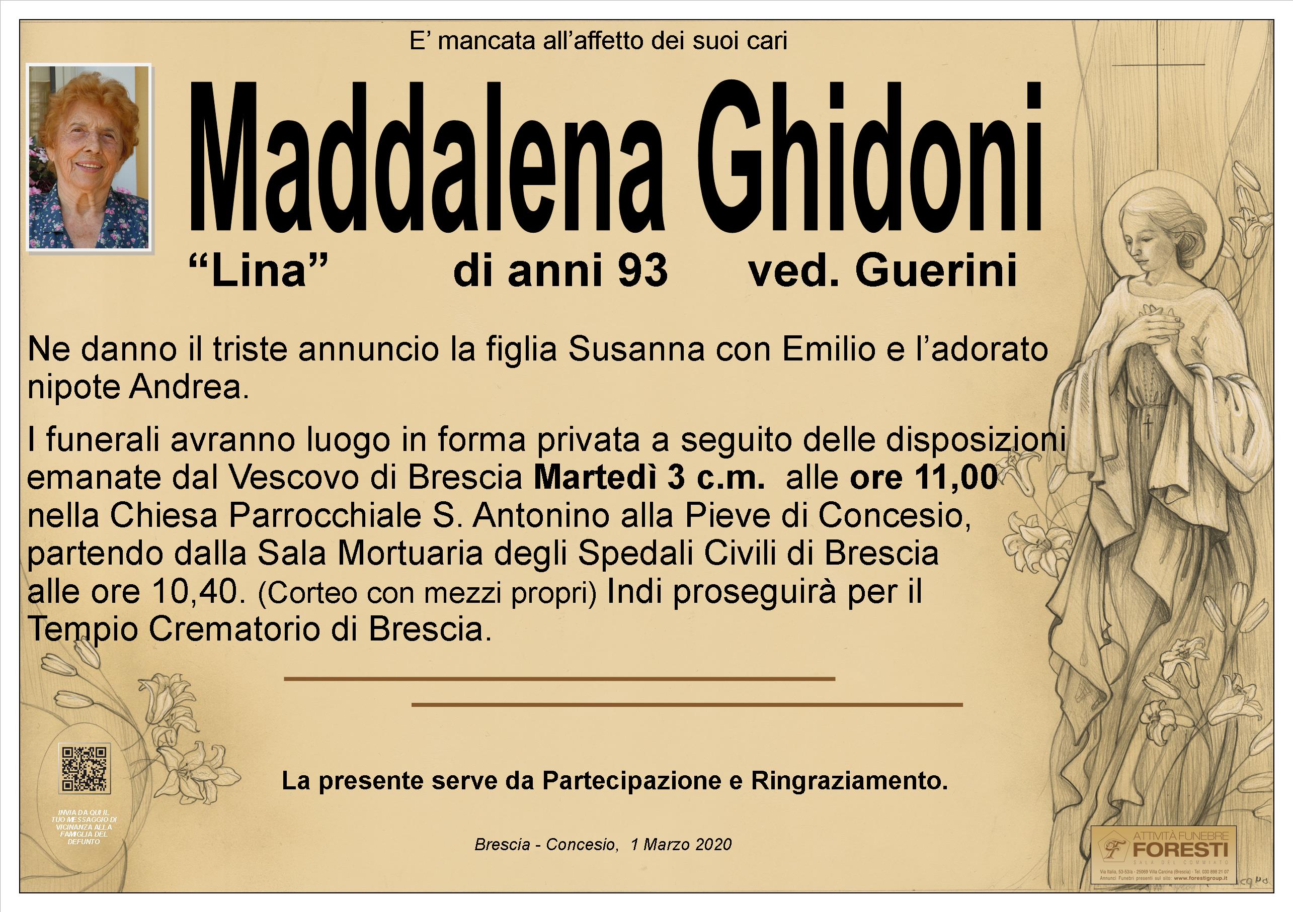 I funerali avranno luogo in forma privata a seguito delle disposizioni emanate dal Vescovo di Brescia Martedì 3 c.m. alle ore 11,00 nella Chiesa Parrocchiale S. Antonino alla Pieve di Concesio.