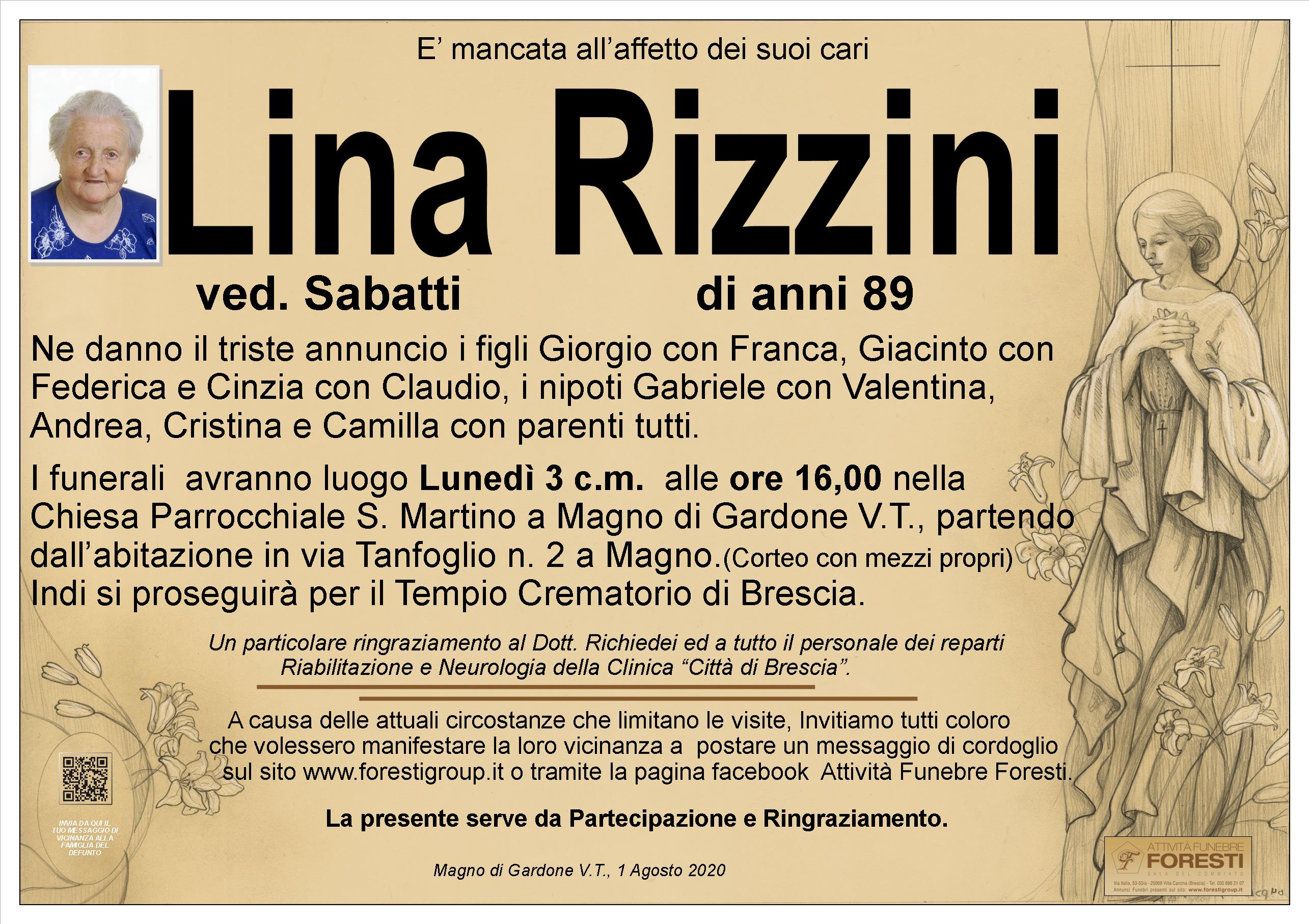 I funerali avranno luogo Lunedì 3 c.m. alle ore 16,00 nella Chiesa Parrocchiale S. Martino a Magno di Gardone V.T., partendo dall’abitazione in via Tanfoglio n. 2 a Magno.(Corteo con mezzi propri) Indi si proseguirà per il Tempio Crematorio di Brescia.