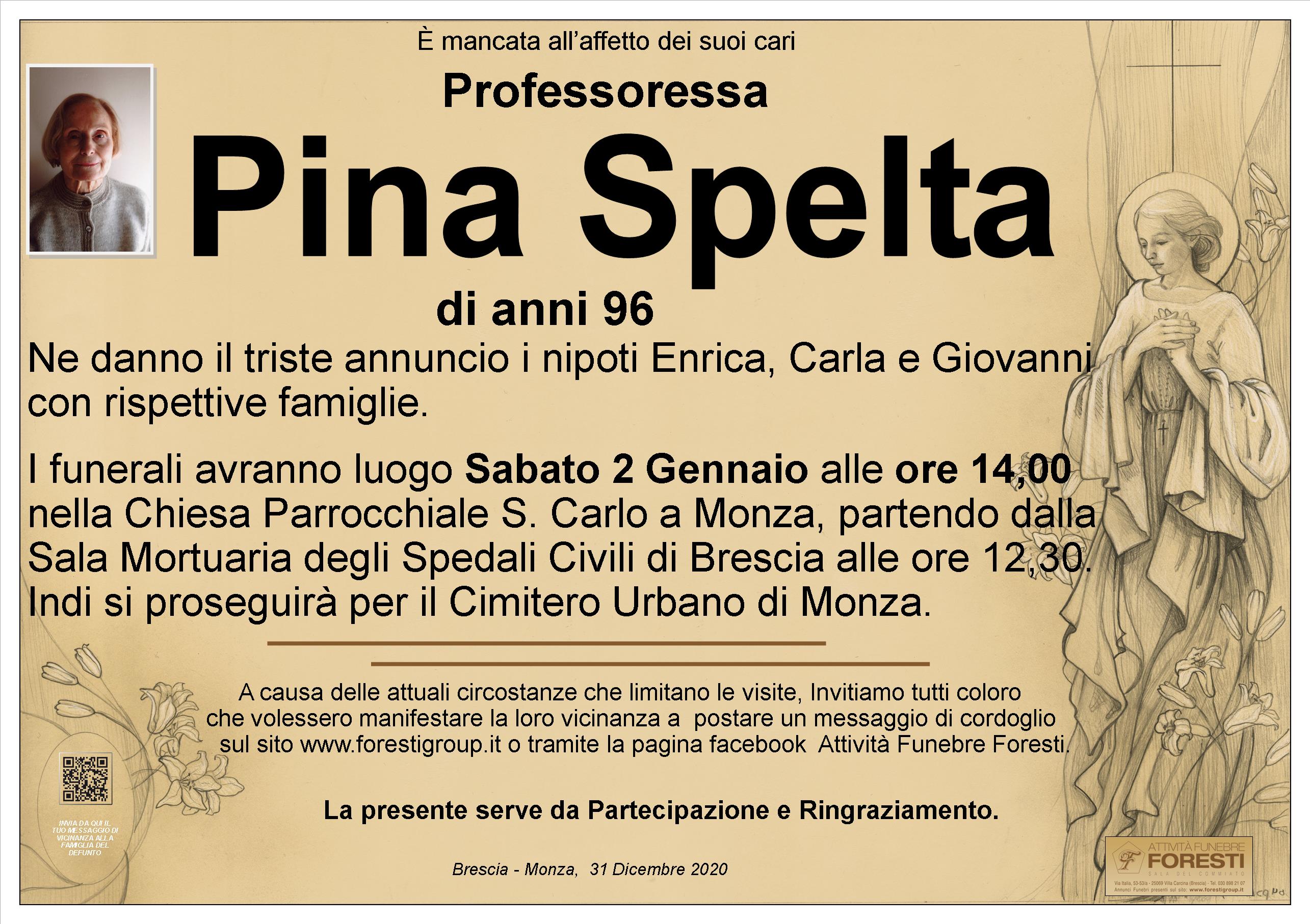 Ricordo con profondo affetto la carissima prof. PINA SPELTA che per tanti anni mi ha onorato della sua amicizia. Non potrò dimenticare il suo sorriso, la sua grande umanità, i suoi preziosi consigli. Con immenso rimpianto. Teresa Scotta' - Vimercate