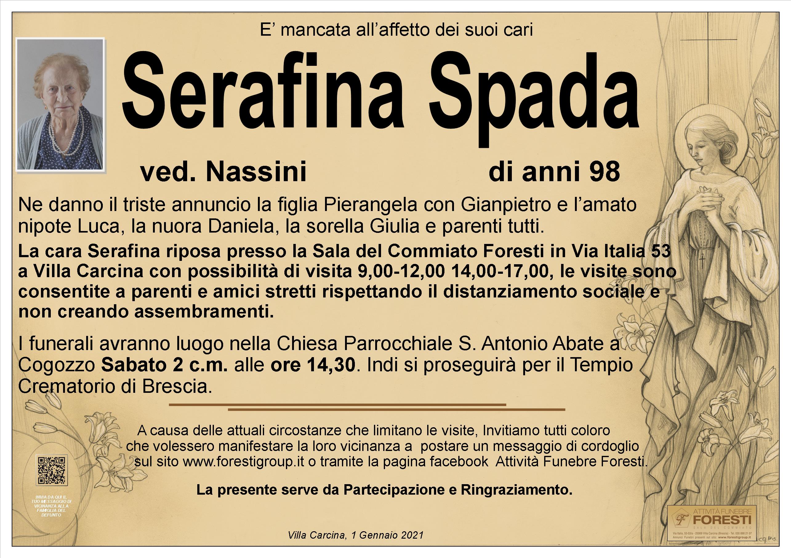 La cara Serafina riposa presso la Sala del Commiato Foresti in Via Italia 53 a Villa Carcina con possibilità di visita 9,00-12,00 14,00-17,00, le visite sono consentite a parenti e amici stretti rispettando il distanziamento sociale e non creando assembramenti.