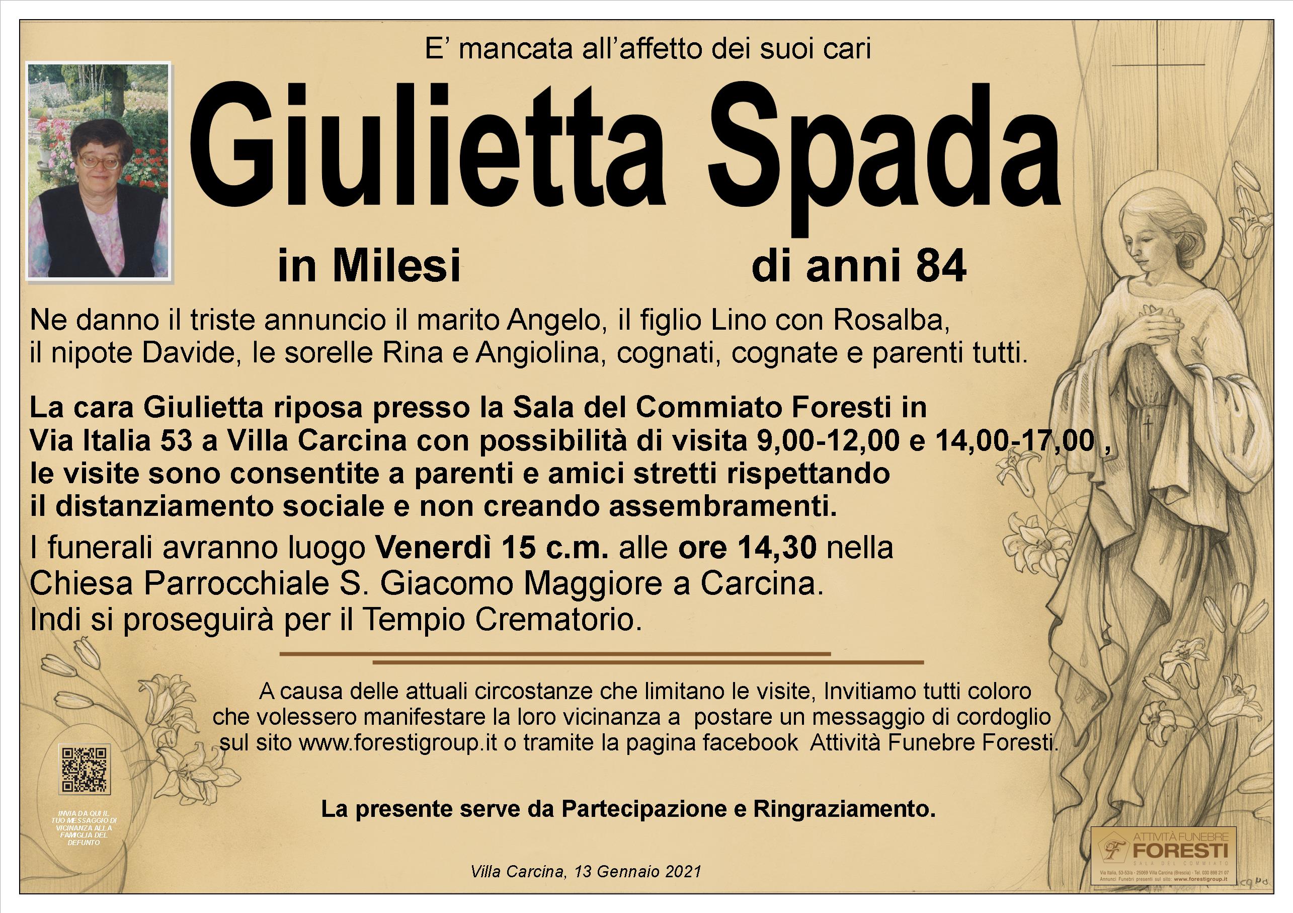 La cara Giulietta riposa presso la Sala del Commiato Foresti in Via Italia 53 a Villa Carcina con possibilità di visita 9,00-12,00 e 14,00-17,00, le visite sono consentite a parenti e amici stretti rispettando il distanziamento sociale e non creando assembramenti.