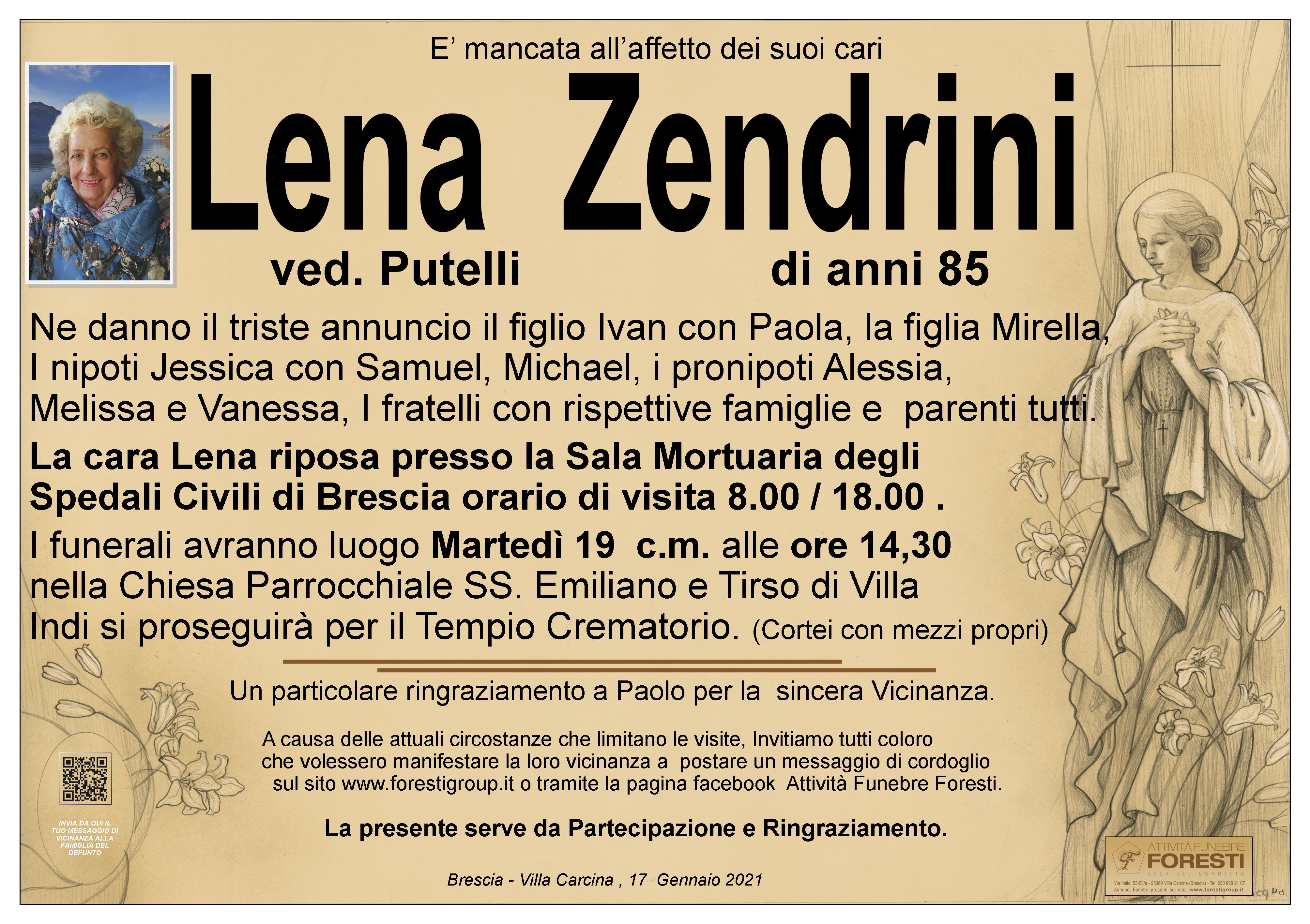 La cara LENA riposa presso l'obitorio degli Spedali Civili di brescia , I funerali verranno celebrati Martedì 19 c.m. alle ore 14,30 nella chiesa parrocchiale SS. Emiliano e Tirso di Villa Carcina , indi per il tempio Crenatorio .