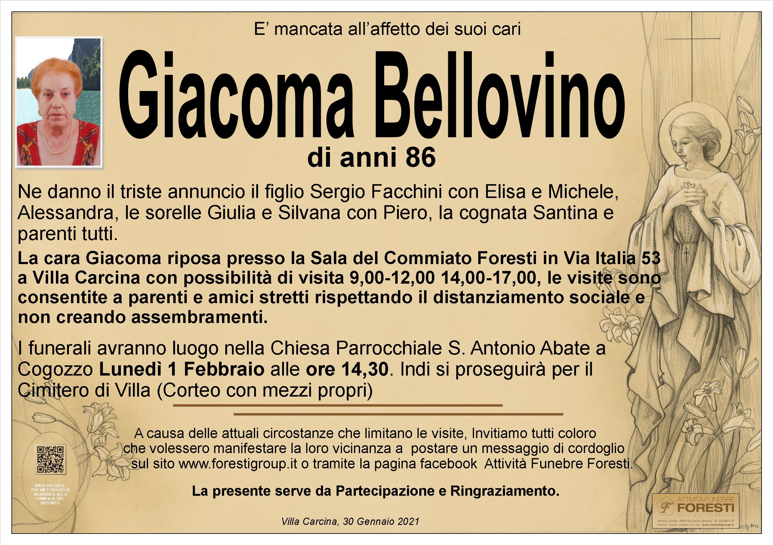 La cara Giacoma riposa presso la Sala del Commiato Foresti in Via Italia 53 a Villa Carcina con possibilità di visita 9,00-12,00 14,00-17,00, le visite sono consentite a parenti e amici stretti rispettando il distanziamento sociale e non creando assembramenti.