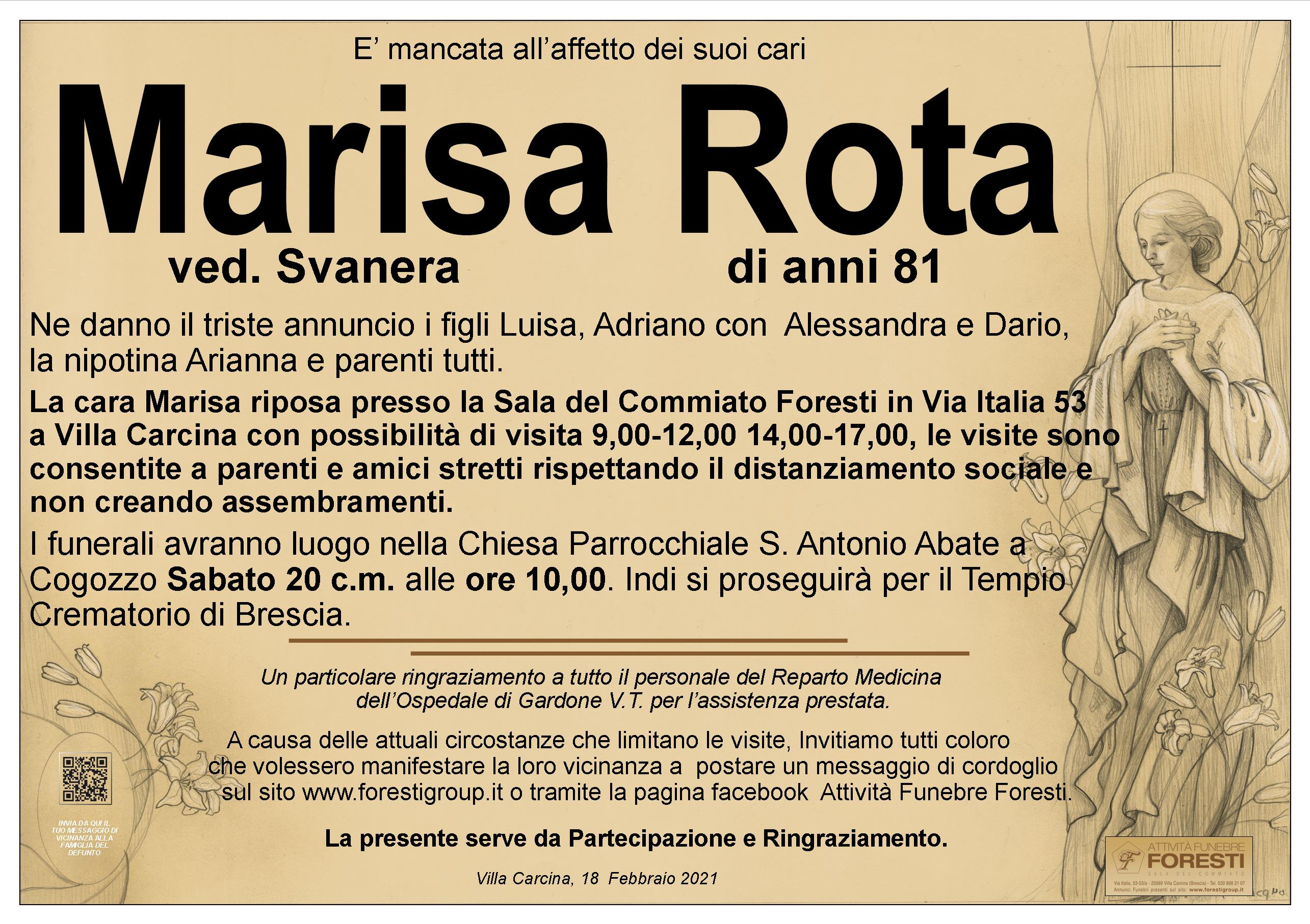 La cara Marisa riposa presso la Sala del Commiato Foresti in Via Italia 53 a Villa Carcina con possibilità di visita 9,00-12,00 14,00-17,00, le visite sono consentite a parenti e amici stretti rispettando il distanziamento sociale e non creando assembramenti.