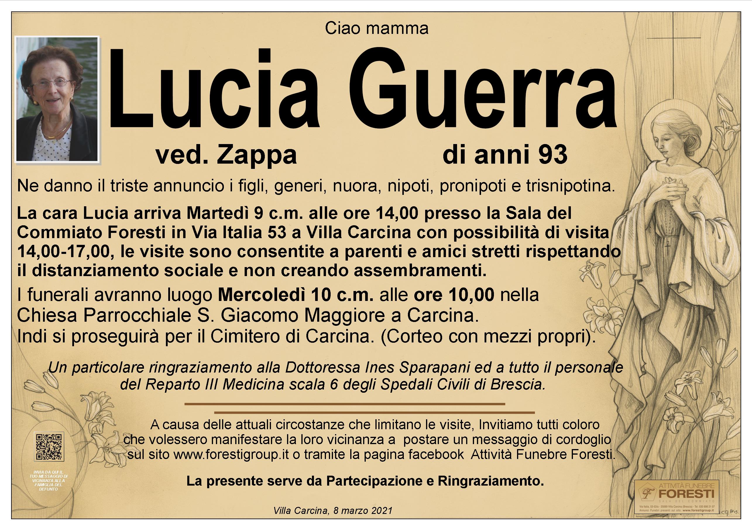 La cara Lucia arriva Martedì 9 c.m. alle ore 14,00 presso la Sala del Commiato Foresti in Via Italia 53 a Villa Carcina con possibilità di visita 14,00-17,00, le visite sono consentite a parenti e amici stretti rispettando il distanziamento sociale e non creando assembramenti.